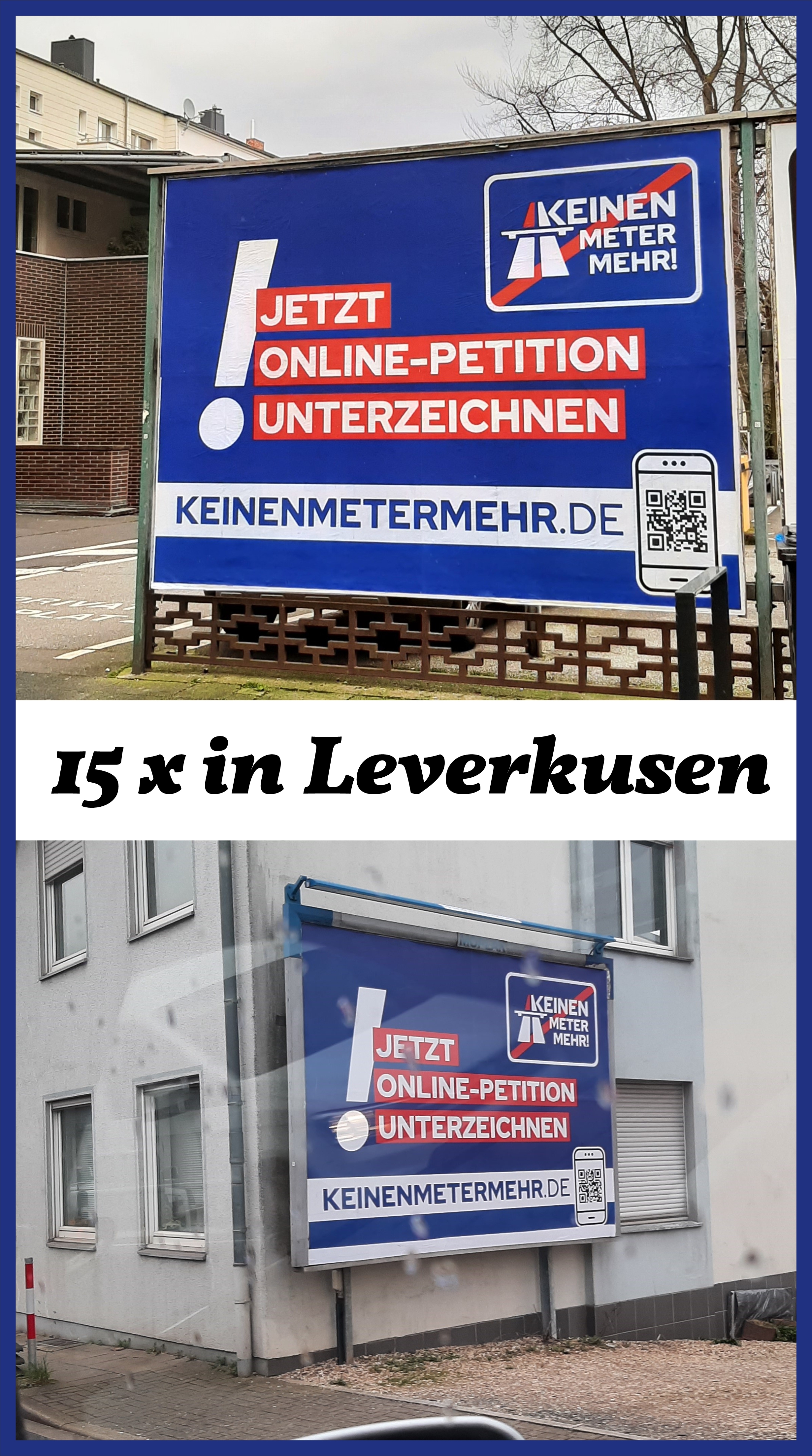Wir, die Leverkusenerinnen und Leverkusener - und alle betroffenen Bürgerinnen und Bürger ausder dem UmlandRegion - sind entsetzt über die Ausbauplanungen des Bundesministeriums für Digitales und Verkehr (BMDV) und der Autobahn GmbH des Bundes für die Autobahnen 1 und 3 in Leverkusen. Diese Planungen verhindern/erschweren eine zukunftsfähige, nachhaltige, ökonomische, ökologische und sozialverträgliche Stadtentwicklung in Leverkusen