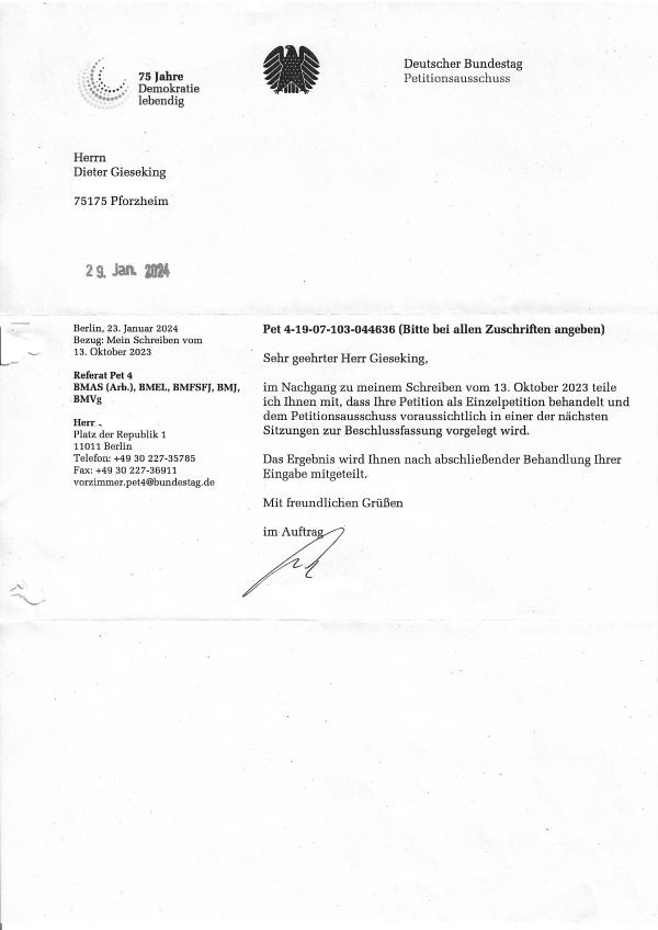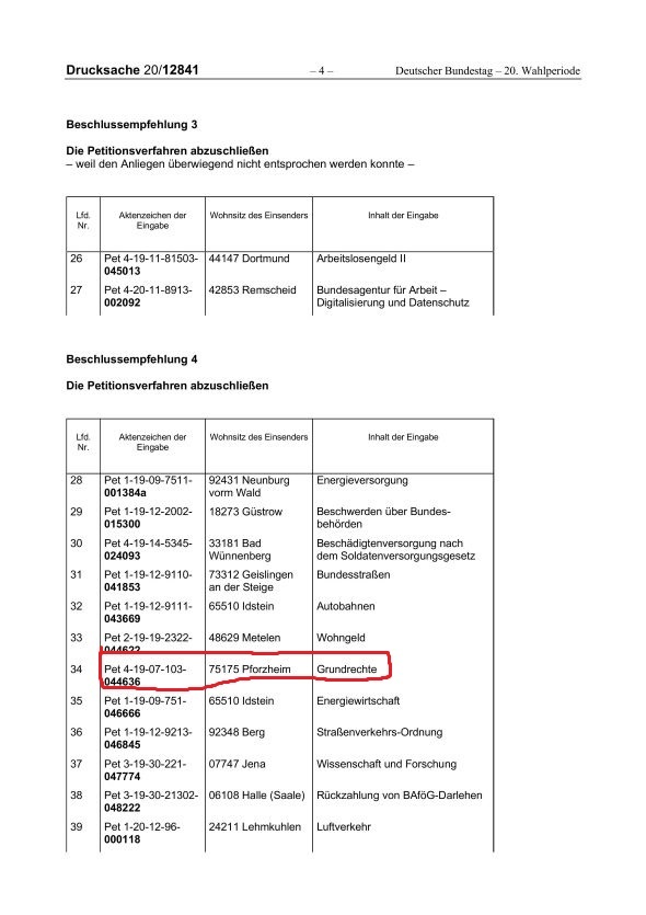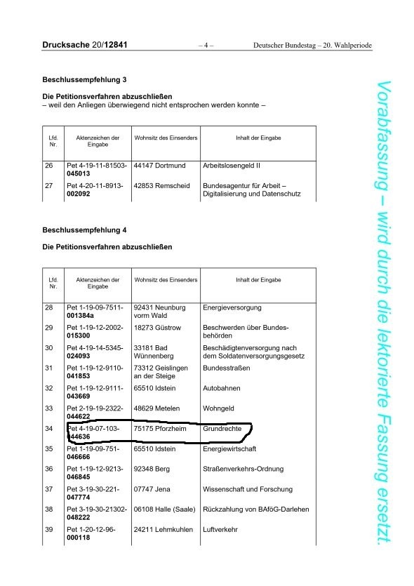 Der Petitionsausschuss des Deutschen Bundestages hat am 11. September 2024 eine Beschlussempfehlung(Drucksache 20/12841) abgegeben. Über die K13online-Petition(Pet- 4-19-07-103-044636) wird unter Beschlussempfehlung 4(Lfd. Nr. 34) am 26. September 2024 abgestimmt. Die Abstimmung zur Sammelübersicht 641 wird LIVE im Parlaments-TV übertragen. Der TOP 38 soll um 14:25 Uhr stattfinden...