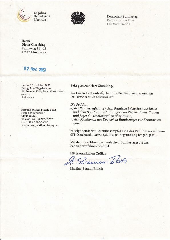 Abschließend erhalten wir vom Petitionsausschuss die schriftliche Begründung. Auch darüber erhalten alle Mitzeichner/Innen Nachricht.