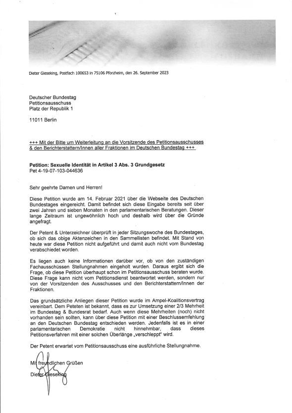 Die Beschlussempfehlung an den Deutschen Bundestag hinsichtlich der sexuellen Identität in Artikel 3 Abs. 3 Grundgesetz lässt weiterhin auf sich warten. Der Petitionsdienst hatte Anfang d. J. mitgeteilt, dass der Ausschuss in einer der kommenden Sitzungen beschließen wollte. Wir warten auf diese Beschlussempfehlung nach der parlamentarischen Sommerpause im Herbst 2024.