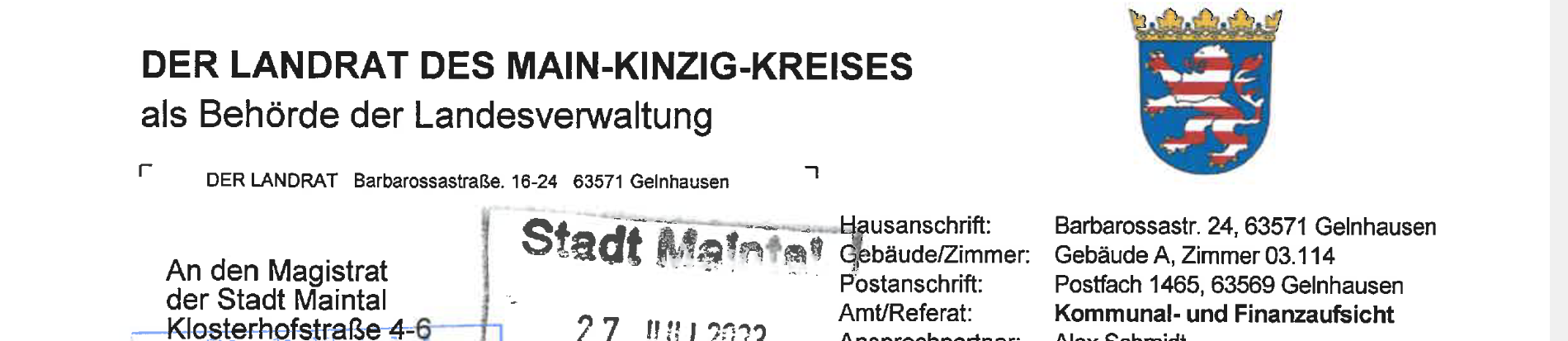 So sieht ein blauer Brief für eine Stadt aus: Die Kommunalaufsicht des Kreises fordert Änderungen im kommunalen Haushalt Maintals. Und der Neubau des Maintalbads steht dabei auch im Mittelpunkt: