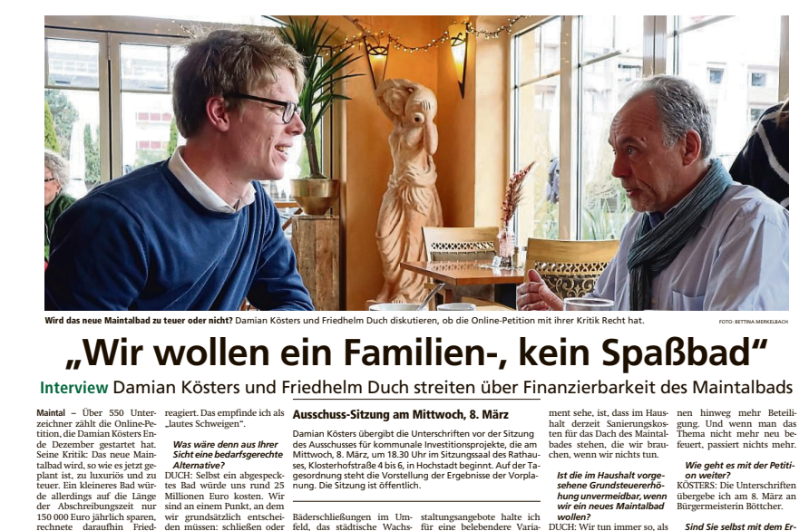 Mit Friedhelm Duch von der Fraktion B90/Grüne hatte ich am letzten Samstag ein Gespräch zum Maintalbad und der Debatte dazu. Der Maintaler Tagesanzeiger war dabei und müsste es in den nächsten Tagen (vielleicht ja mal am Samstag? ;-) ) drucken. Auch an dieser Stelle: Vielen Dank an Herrn Duch für die Offenheit, über das Thema zu diskutieren.