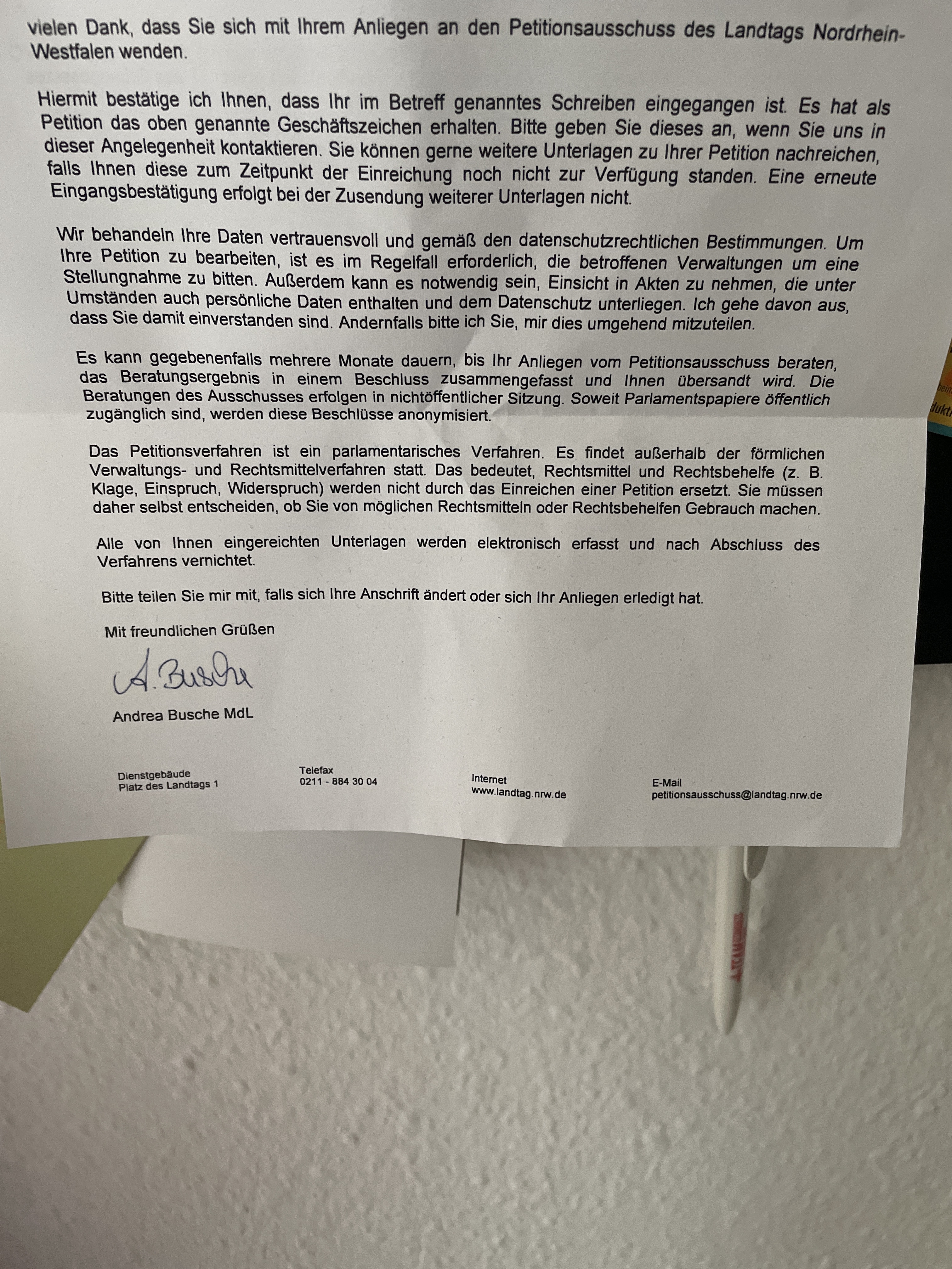 Liebe Unterstützer, die Petition wurde beim Landtag in Person von Frau Andrea Busche eingereicht und der Empfang schriftlich bestätigt. Es kann nun mehrere Monate dauern bis unser Anliegen beim Petitionsausschuss beraten wird. Wir werden im Anschluss über das Ergebnis informiert. Ich danke für Ihre Unterstützung und werde mich melden wenn es neue Informationen gibt.