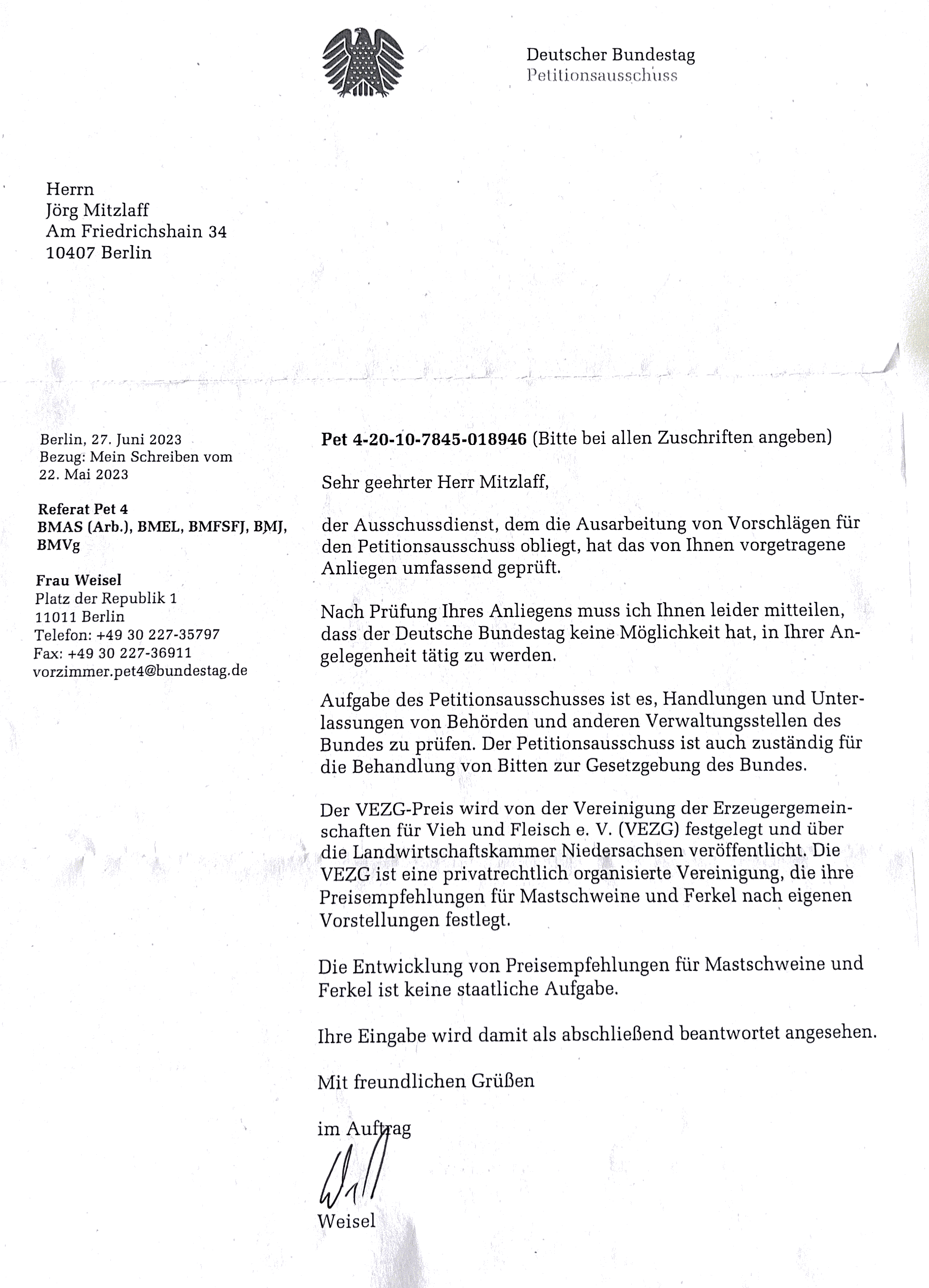 der Petitionsausschuss hat das Anliegen geprüft und keine Möglichkeit gesehen, in der Angelegenheit tätig zu werden, da die Entwicklung von Preisempfehlungen für Mastschweine und Ferkel keine staatliche Aufgabe ist. Weitere Details können Sie dem Schreiben im Anhang entnehmen.
