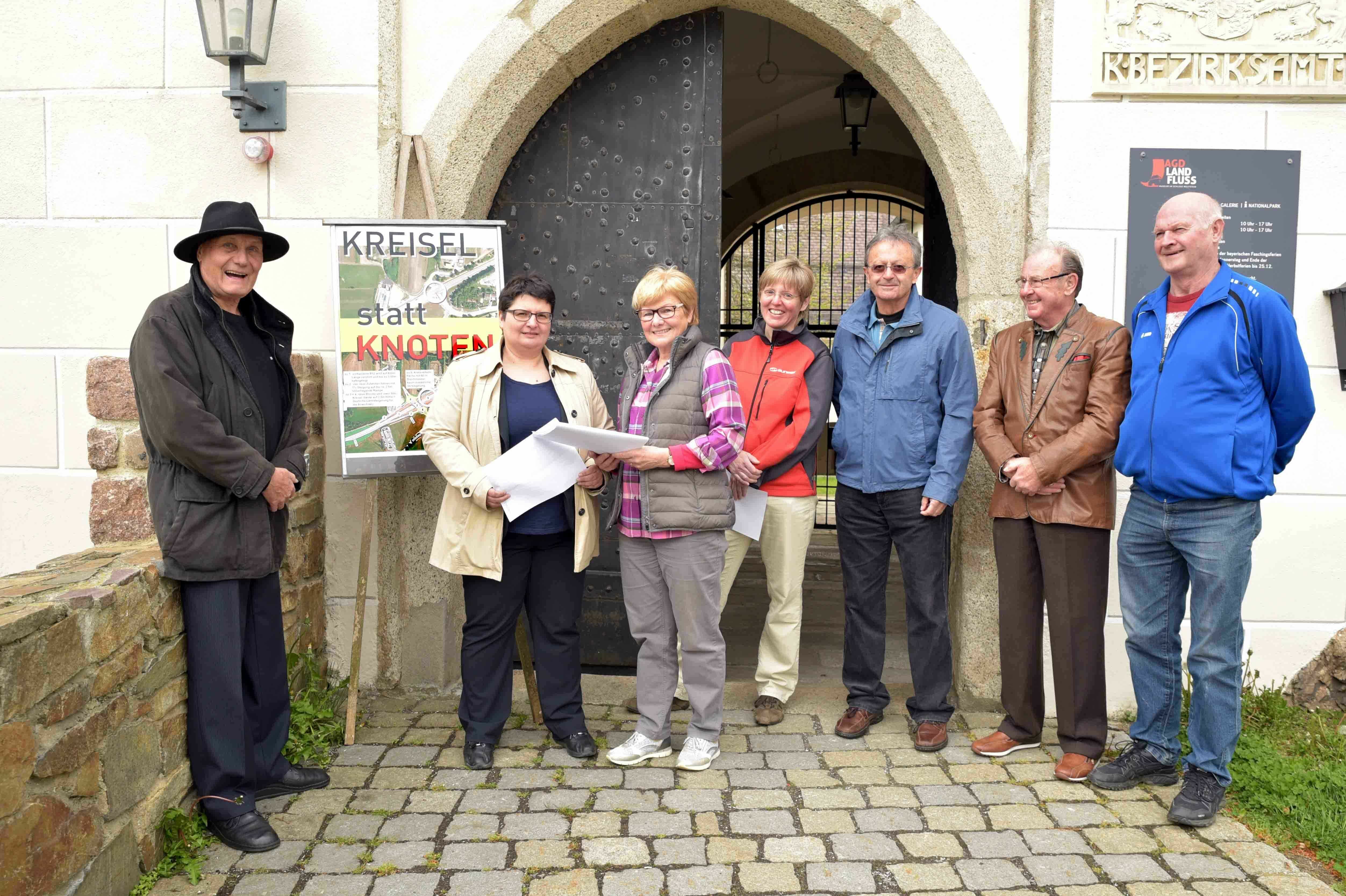 „Wenn die Umbaupläne des Straßenbauamtes dann einmal öffentlich ausgelegt sind, werden viele Bürger sehr genau hinschauen! Die vom Strassenbauamt Passau vorgeschlagene Variante ist zur Entschärfung des Unfallschwerpunktes auf jeden Fall der gänzlich falsche Weg“, so Kreiselbefürworter und Initiator der Bürgerinitiative Sepp Gais aus Ort bei Freyung. Bei der Übergabe von 1.620 Unterschriften der Online-Petition „Kreisel statt Knoten“ an die Stellvertreterin des Landrats, Frau Judith Wunder, betonte die anwesende Delegation der Knotengegner noch einmal die vielen Vorteile von Kreisverkehren: keine Unfalltote und Schwerverletzte mehr, kaum zusätzliche Bodenversiegelung, ein Bruchteil an Baukosten, kaum Folgekosten, kurze Bauzeit, einfache und schöne Einbindung in ländliches Umfeld.