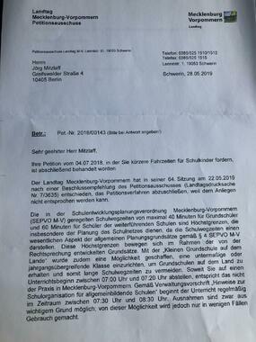 die Petition, in der kürzere Fahrzeiten für Schulkinder gefordert werden, wurde abschließend behandelt. Im Anhang finden Sie die Stellungnahme des Landtages - das Petitionsverfahren ist damit abgeschlossen.
