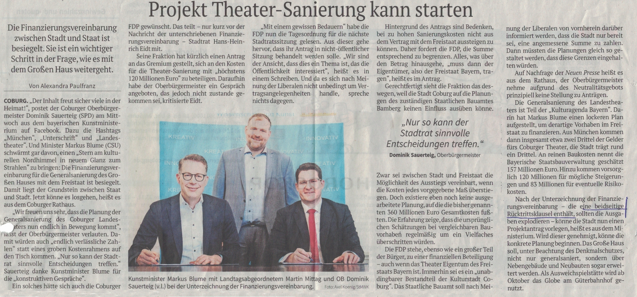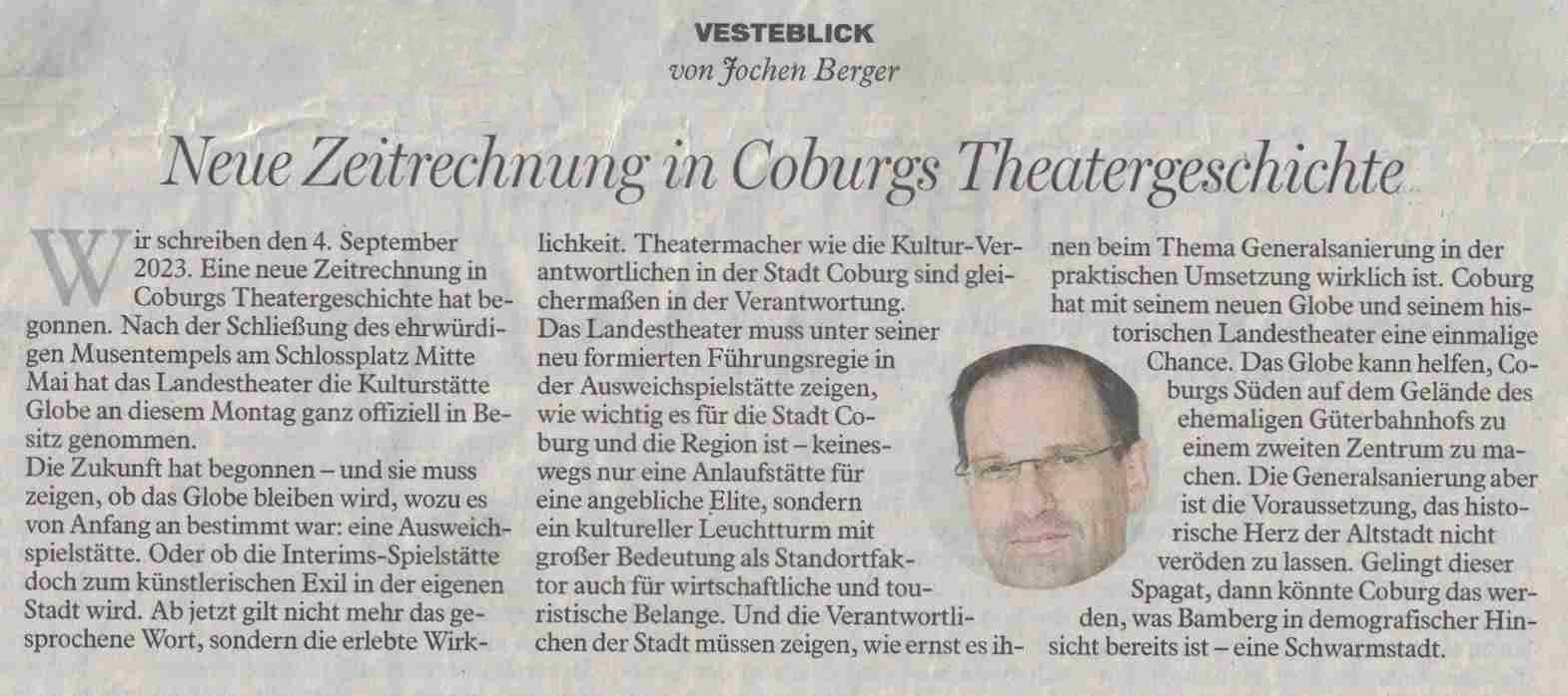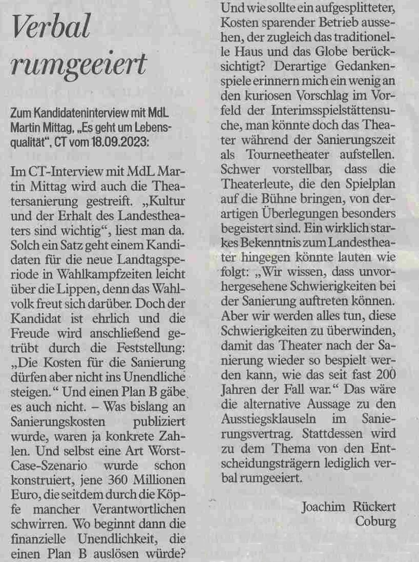 Coburger Tageblatt 18.09.2023: Interview mit Martin Mittag, Landtagsabgeordneter CSU, Mitglied des einflussreichen Theaterausschusses.