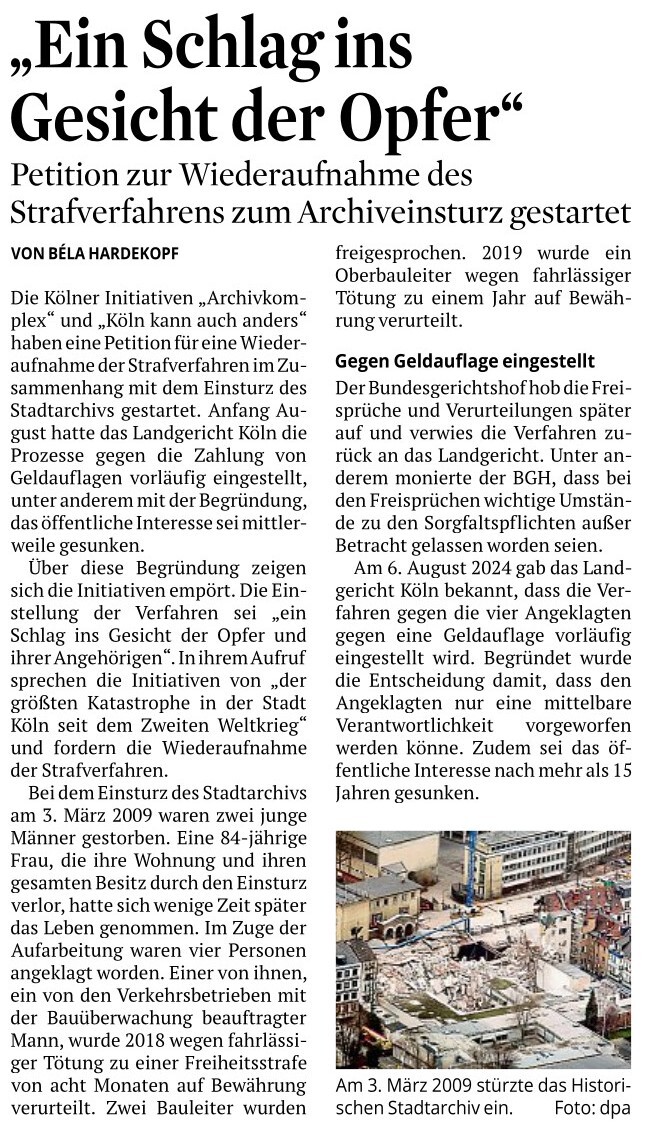Bericht im Kölner Stadt-Anzeiger 20.8.2024 27.08.2024, 14:43 www.ksta.de/koeln/petition-zur-wiederaufnahme-des-stadtarchivprozesses-gestartet-847237
