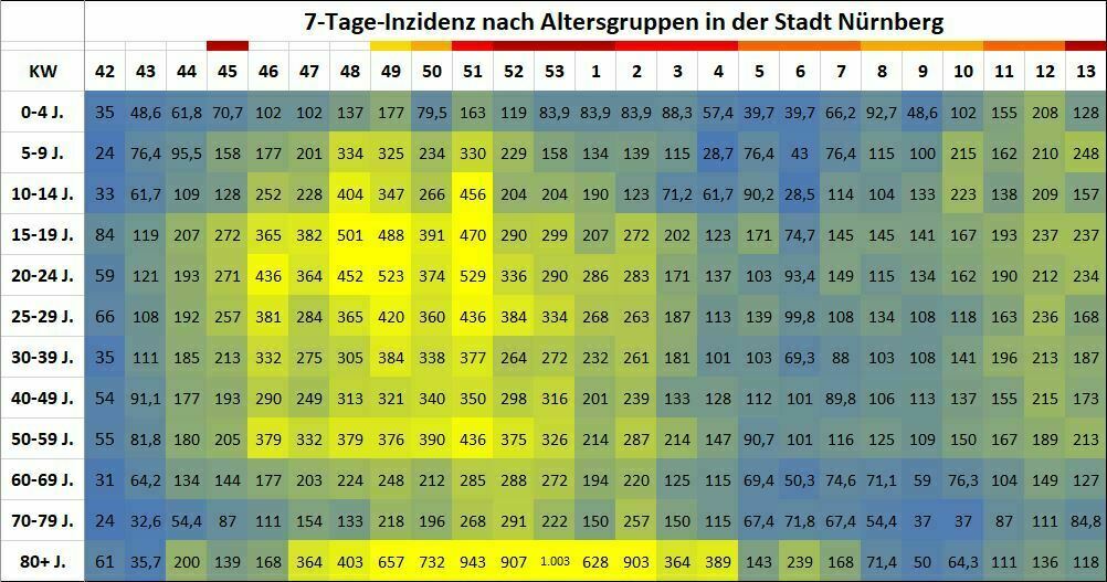 In Nürnberg ist die Inzidenz heute auf 231, 1 gestiegen. Die Fallzahl ist nach wie vor bei den Kindern am Höchsten. Nur durch die verpflichtende Tests bei den Schulkindern wird das nun erstmals realistisch erfasst. Es ist schlimm wie stark das Infektionsgeschehen ist und dass wir das bisher gar nicht gesehen haben. Die Inzidenz in der aktuellen Woche ist bei den älteren Oberschülern, also den Kindern die in die Abschlussklassen (+11.) auf bisher 365 gestiegen, noch fehlen aber zwei Meldetage. (Grundschulkinder: 248, junge Oberschüler: 232).