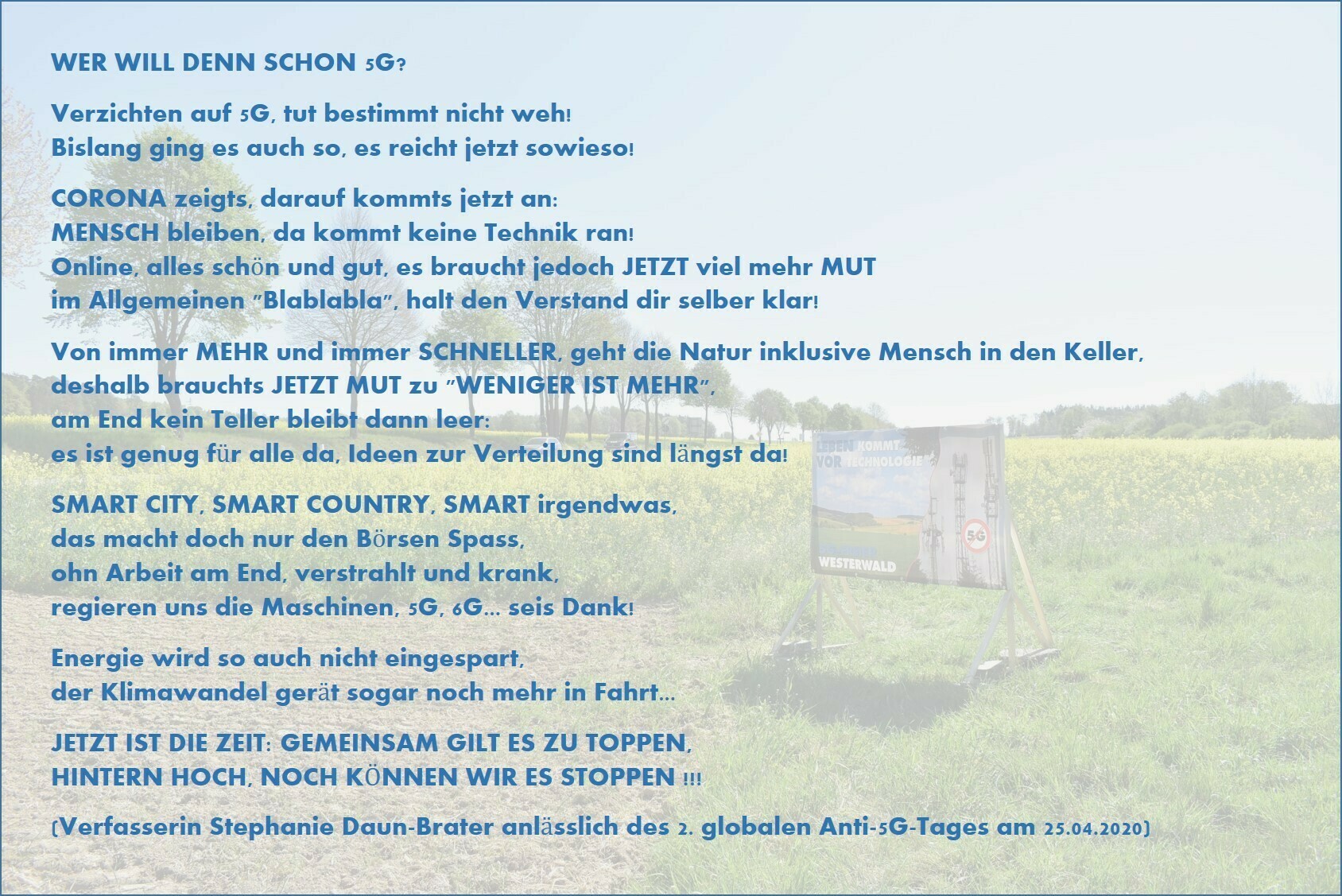 Mit einigen Worten möchte ich Ihnen die Arbeit der Bürgerinitiative hier im Westerwald beschreiben: Seit einem Jahr haben wir uns in einer kleineren Gruppe von zehn Menschen getroffen, um uns darüber auszutauschen, welche Folgen ein weiterer Ausbau des Mobilfunks (vor allem 5G) haben würde. Am 8.3.20 wurde dann in Hachenburg unsere Bürgerinitiative „Leben kommt vor Technologie“ gegründet. Wir zählen zurzeit ca. 40 Teilnehmer, die sich vor allen Dingen für einen gesunden und strahlungsarmen Westerwald engagieren wollen.