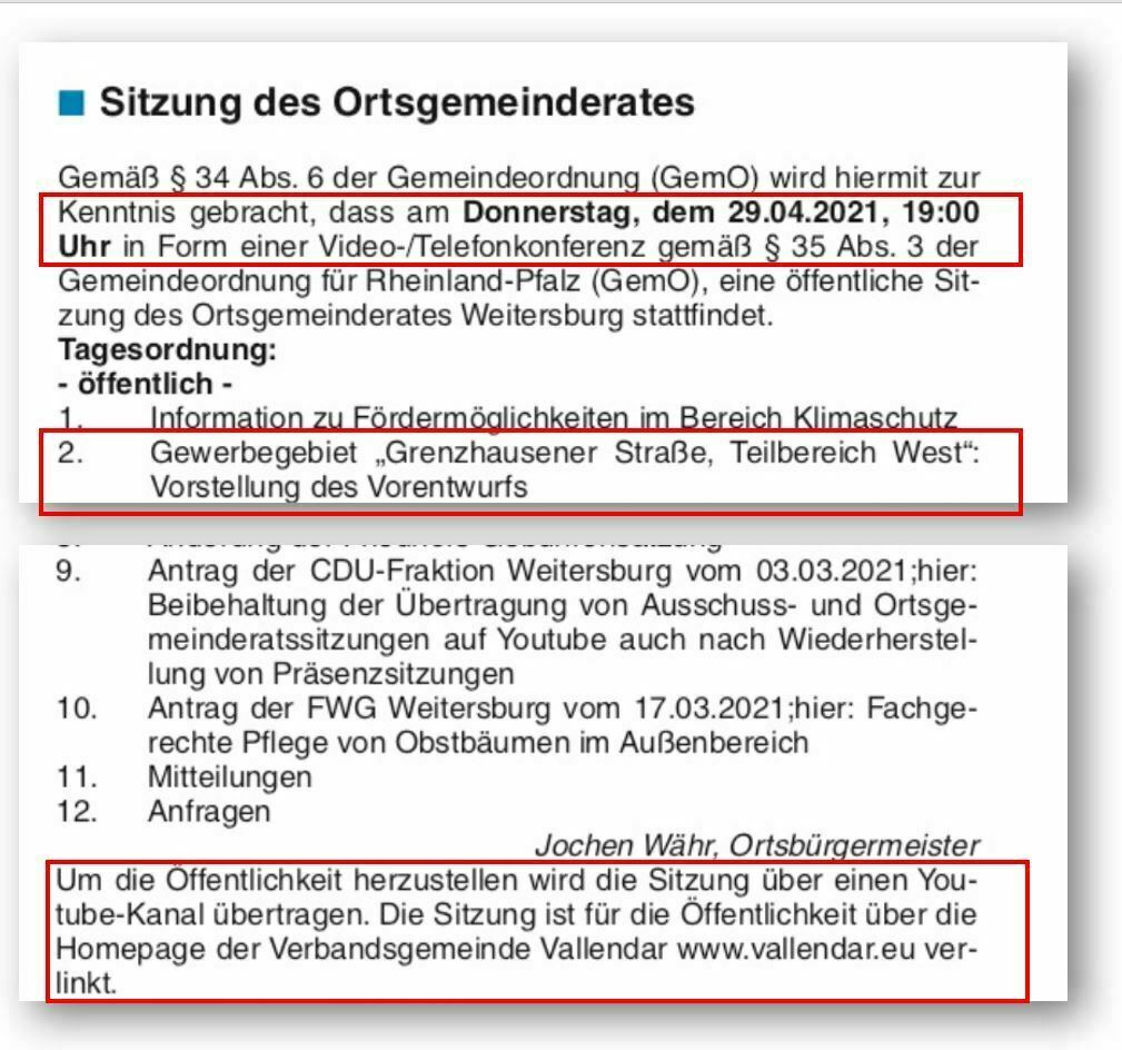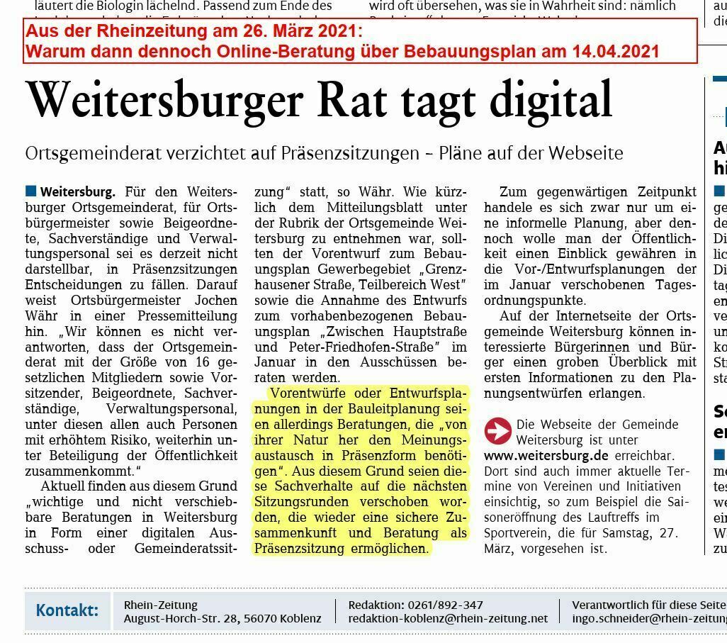 Am 26. März hat der Ortsbürgermeister in der Rheinzeitung verkünden lassen, dass Bebauungspläne "von ihrer Natur her den Meinungsaustausch in Präsenzform benötigen." Die Beratung darüber soll daher verschoben werden, bis wieder Präsenzsitzungen möglich sind.