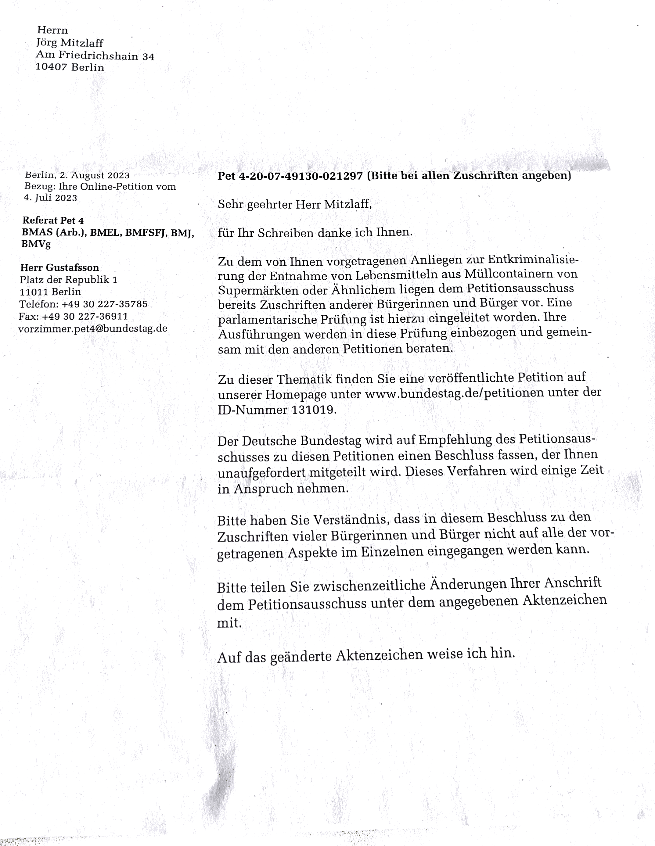 Zu dem Anliegen liegen bereits ähnliche Eingaben von anderen Petitionsstartenden vor. Der Deutsche Bundestag wird auf Empfehlung des Petitionsausschusses zu diesen Petitionen einen Beschluss fassen.