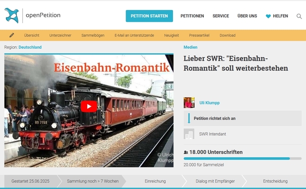 Ein mehr als eindeutiges Zeichen an den SWR-Intendanten, Herrn Prof. Dr. Kai Gniffke, Eisenbahn-Romantik weiterbestehen zu lassen. Mal sehen, ob er den Mut hat, über seinen eigenen Schatten zu springen und die Entscheidung zumindest zu überdenken. Der Initiator der Petition, Ulrich Klumpp, ist gesprächsbereit.