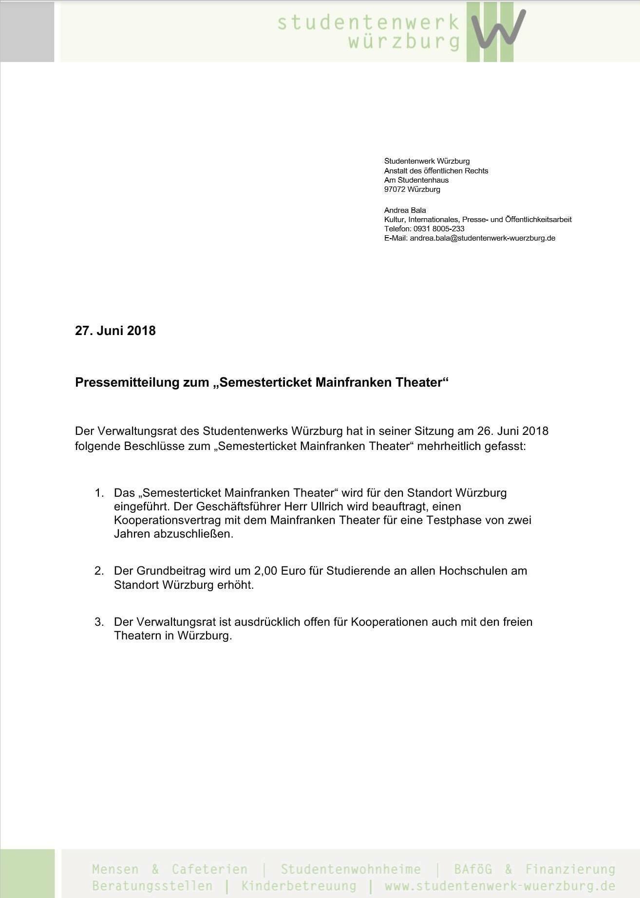 "Die Geschäftsführung des Studentenwerks Würzburg erarbeitet zusammen mit der Leitung des Mainfrankentheaters einen Vertragsentwurf für ein „Semesterticket Theater“, der die Absichtserklärung über ein Theaterticket zwischen den Studierendenschaften der Würzburger Hochschulen und dem Mainfrankentheater zur Grundlage hat. Dies soll auf rechtlich gangbaren Weg und einer Erprobungsphase von längstens zwei Jahren erfolgen.