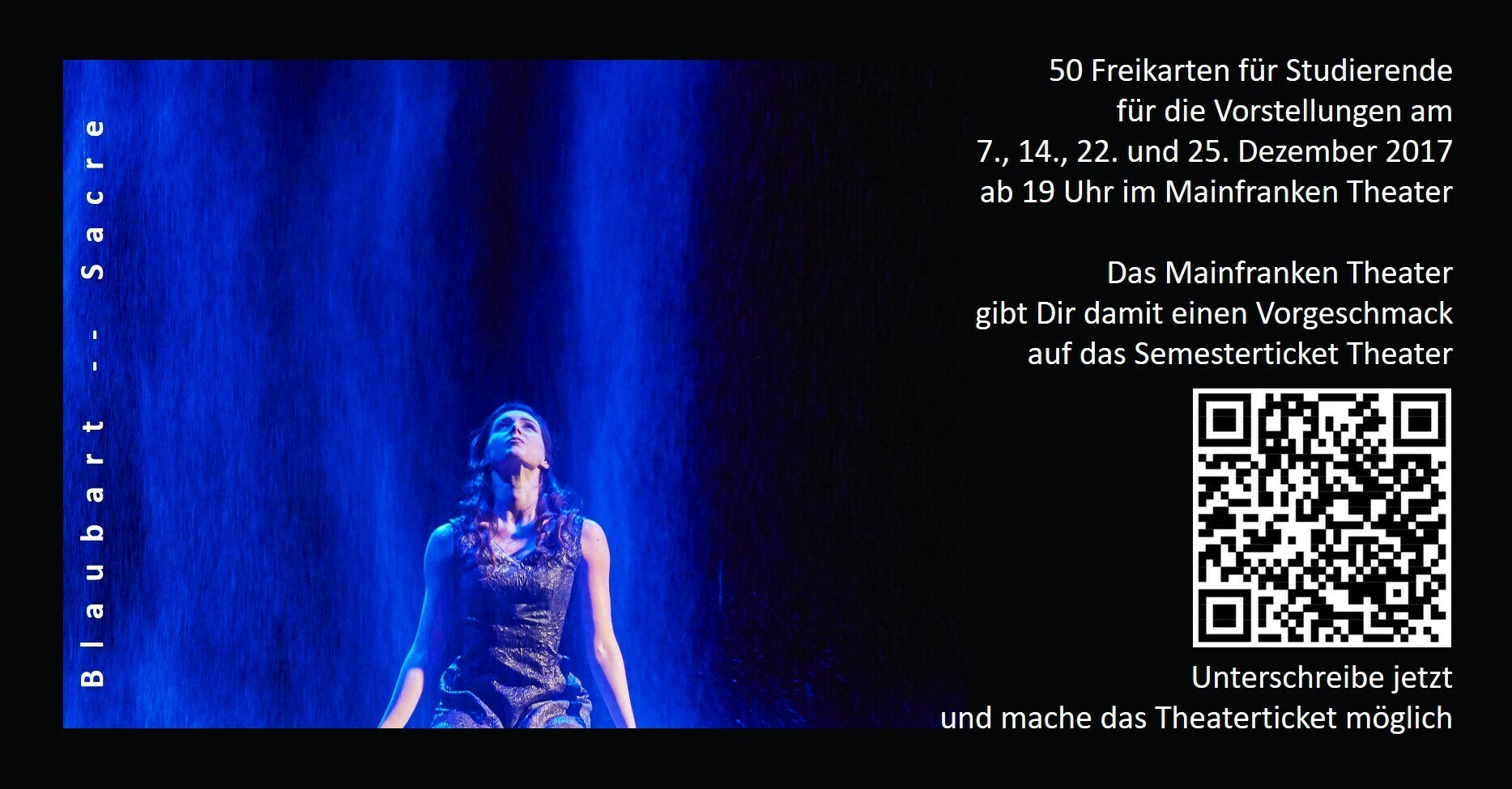 Und auch wenn wir das (natürlich nur das!) nicht schaffen, umsonst sollen Eure bisherigen Unterschriften, all die Mithilfe und die große Unterstützung nicht sein: DAS MAINFRANKEN THEATER SCHENKT EUCH SCHON JETZT FREIEN EINTRITT zu seiner Produktion "Blaubart -- Sacre", einer Kooperation seiner Opern- und Ballettsparte. Zu welchen Terminen, könnt Ihr dem angehängten Bild entnehmen. Toll, was das Mainfranken Theater bietet, noch bevor wir überhaupt einen Vertrag und eine Kooperation haben! Oder? Vielleicht möchtet Ihr ja ein paar Freunde zu der Aufführung mitnehmen, um sie auch von dem Semesterticket Theater zu begeistern. Macht das... es wäre doch schön, wenn an den Aufführungstagen das Theater voll ist!