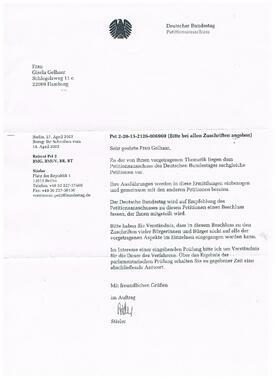heute erhielt ich vom Petitionsausschuss einen Brief mit dem "abschließenden Bericht der Bundesregierung zu Ihrer Petition mit der Bitte um Kenntnisnahme". Und: "Damit ist das Petitionsverfahren beendet."