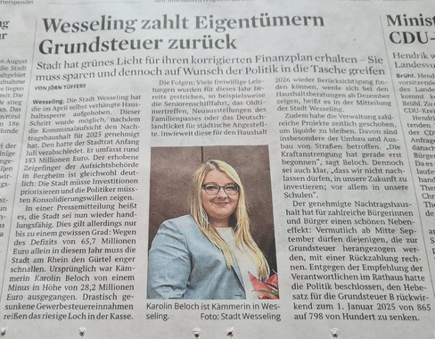 Die Grundsteuerreform sollte laut Bundesregierung für die Kommunen insgesamt aufkommensneutral ausgestaltet werden; also für die Städte- und Gemeinden keine Mindereinnahmen verursachen. Allerdings haben Kommunen das Recht, den Hebesatz der Grundsteuer im Rahmen der Hebesatzautonomie eigenständig festzulegen. Mit Stand 07. Juli 2025 würde die Stadt Wesseling mit den bisher geltenden Grundsteuerhebesätzen aus der Grundsteuer B bis Jahresende 12,8 Mio. Euro einnehmen. Geplant waren 11,8 Mio. Euro. Der vom Land NRW empfohlene und von der Stadt gewählte aufkommensneutrale Hebesatz lag bisher bei 865 von Hundert. Der Rat der Stadt hat mehrheitlich beschlossen, den Hebesatz für die Grundsteuer B rückwirkend zum 01. Januar 2025 auf 798 von Hundert zu senken, um die Aufkommensneutralität zu wahren und keine Mehreinnahmen aus der Grundsteuerreform für die Stadt zu erzielen. Die Stadt wird voraussichtlich im September die erforderlichen Änderungsbescheide erlassen und die Rückzahlungen an die Grundsteuerpflichtigen veranlassen. Die Kämmerin hatte darauf hingewiesen, dass die Einnahmeveränderungen bei den Grundsteuern A und B noch nicht final zu beziffern ist, da beim Finanzamt Brühl noch immer Einsprüche zu den Grundsteuermessbeträgen bearbeitet werden. Daher sind die aktuellen Zahlen nur ein Zwischenstand und nicht ausreichend für das Festlegen eines neuen aufkommensneutralen Hebesatzes.