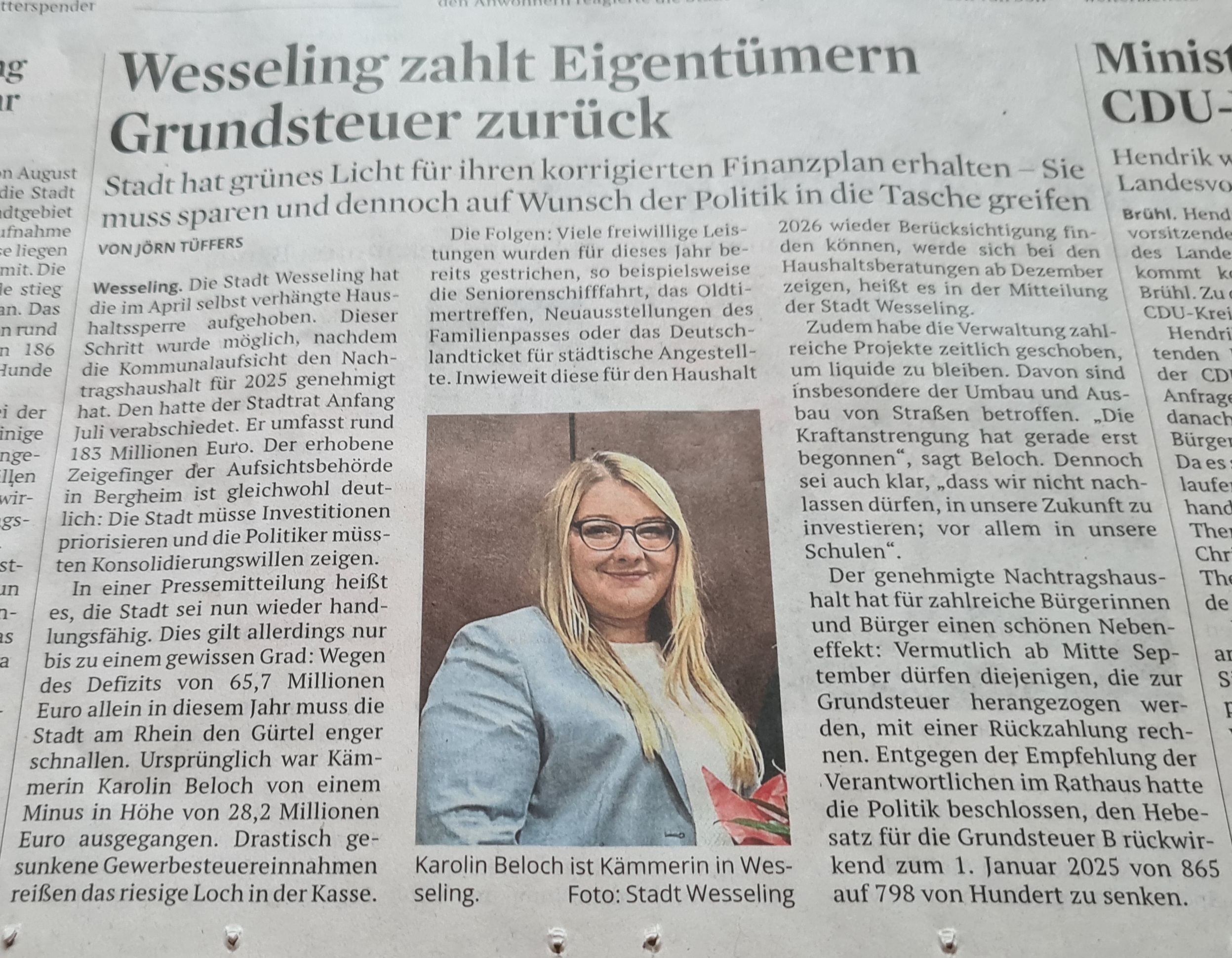 Aufgrund dramatisch sinkender Gewerbesteuereinnahmen musste die Kämmerin der Stadt Wesseling Karolin Beloch am 09. April bis auf weiteres eine Haushaltssperre verhängen und dem Rat danach einen Nachtragshaushalt für das Jahr 2025 vorlegen. Nun hat der Rat der Stadt den Nachtragshaushalt in seiner Sitzung am 08. Juli beschlossen. Sobald dieser von der Kommunalaufsicht des Rhein-Erft-Kreises genehmigt wurde, wird die Stadt wieder die Möglichkeit haben, weitere Kredite aufzunehmen und die Handlungsfähigkeit sicherzustellen. Das könnte voraussichtlich im August der Fall sein.