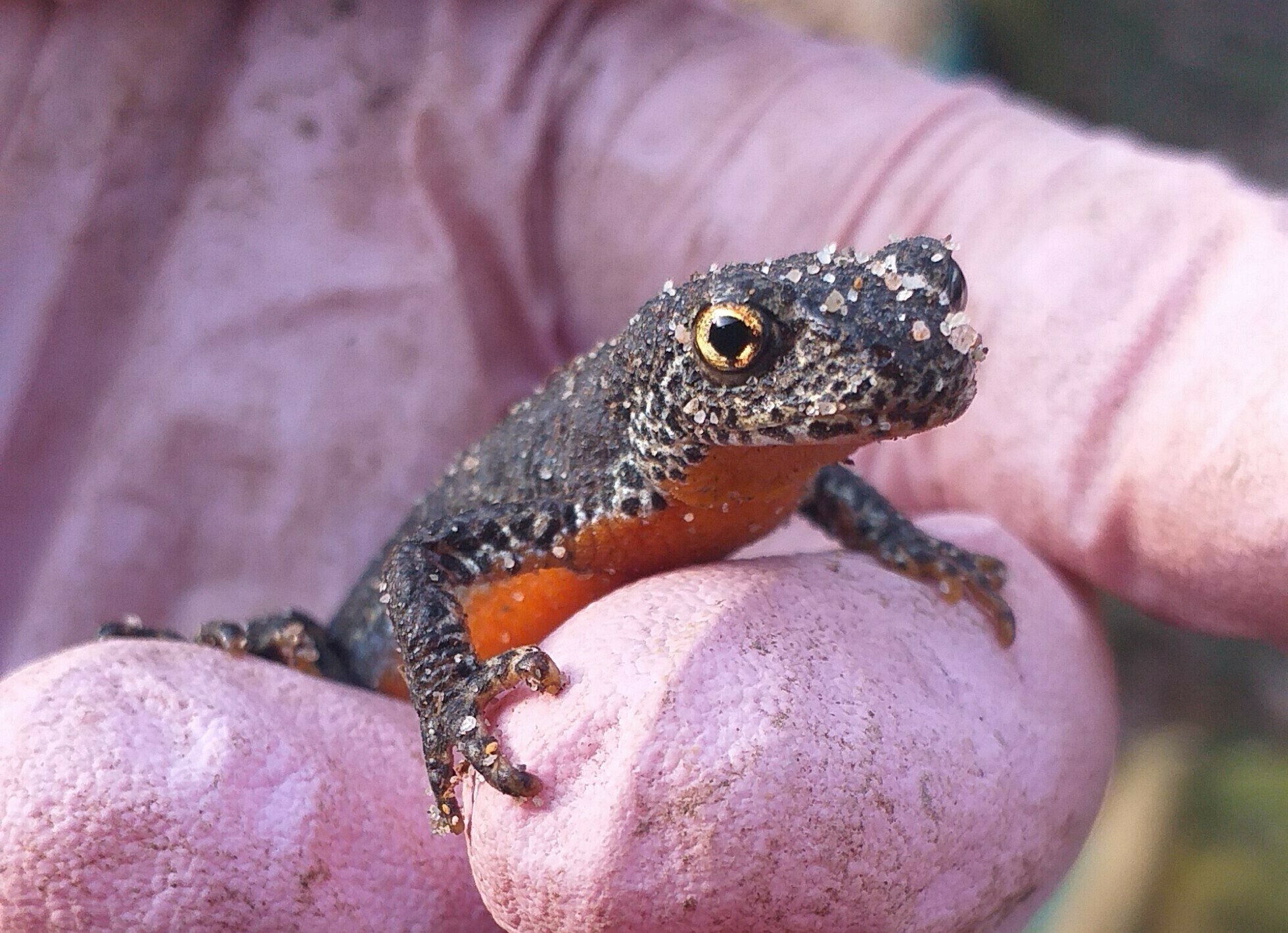 Foto: Männlicher Bergmolch im Prachtkleid, von der diesjährigen Amphibienwanderung. Unsere Amphibien brauchen geschützte Lebensräume und deren Vernetzung für eine sichere Wanderung, sowie ein reichhaltiges Nahrungsangebot durch eine Vielfalt an Insekten.