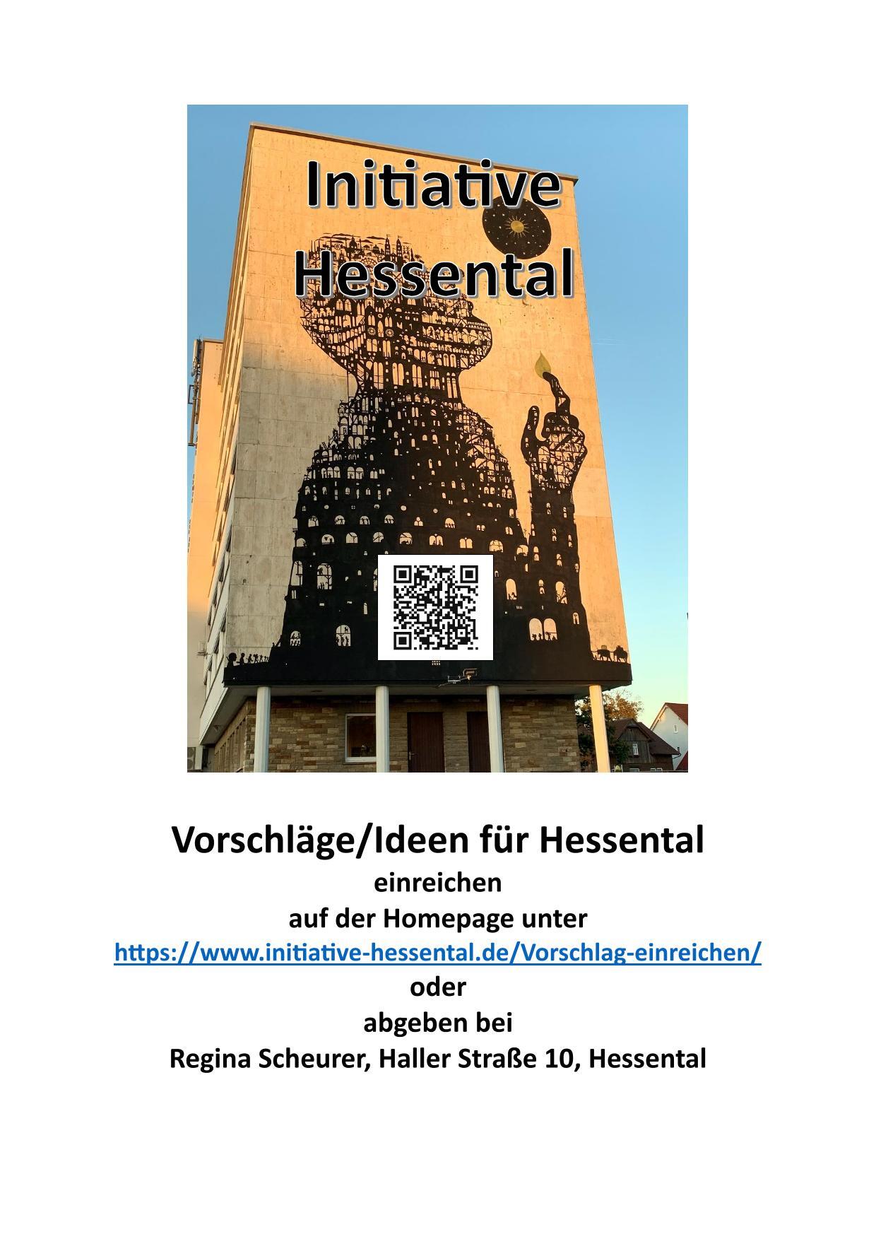 Dabei wollen wir sie mit Ideen und Vorschlägen für Hessental unterstützen. Bitte machen auch Sie mit und teilen uns Ihren Vorschlag oder Ihre Idee für Hessental durch einen Eintrag auf unserer Homepage unter www.initiative-hessental.de/Vorschlag-einreichen/ mit.