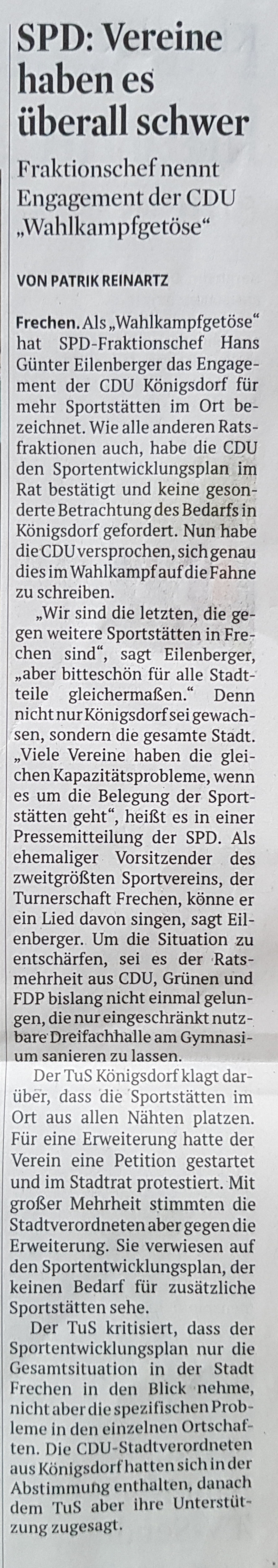 SPD hat sich positioniert, Quelle KStA 20.08.2019, 05:12 SPD sieht keinen spezifischen Bedarf für mehr Sportstätten in Königsdorf.