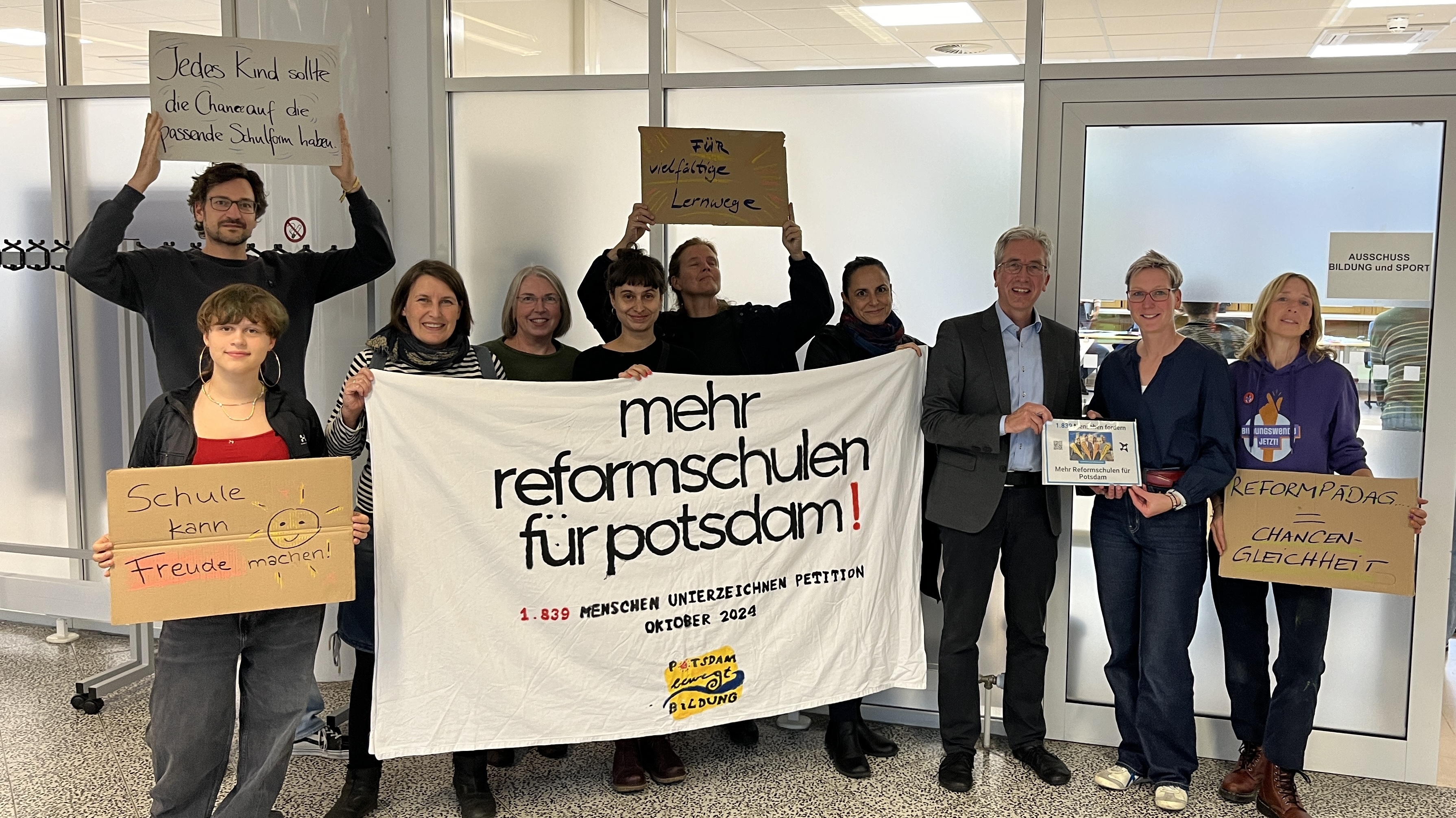 heute haben wir 1.839 Unterschriften für mehr Reformschulen in Potsdam an die Vorsitzende des Bildungsausschusses, Grit Schkölziger (SPD), übergeben. Vor den Mitgliedern des Ausschusses haben wir gefordert, dass die Potsdamer Schulentwicklungsplanung die große Nachfrage nach Schulen mit reformpädagogischem Profil berücksichtigen muss. Mit Transparenten und Plakaten haben wir unser Anliegen unterstrichen.