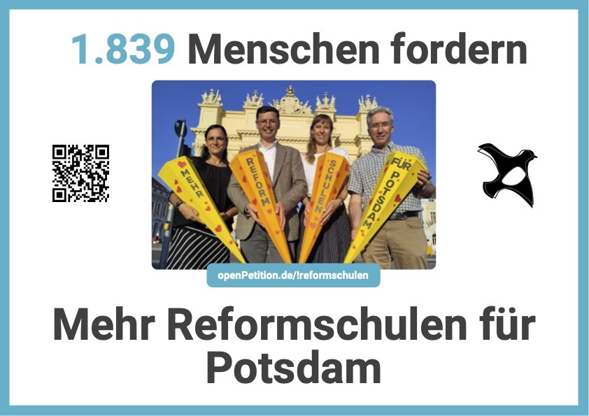 Mit Dir zusammen fordern 1.839 Menschen mehr Potsdamer Schulen, in denen die Kinder mit ihren individuellen Bedürfnissen, Fähigkeiten und Interessen im Mittelpunkt stehen und in denen ein freudvolles und sinnvolles Lernen im eigenen Tempo möglich ist. Das Potsdamer Schulangebot berücksichtigt die große Nachfrage nach staatlichen Schulen mit reformpädagogischem Profil weiterhin zu wenig.