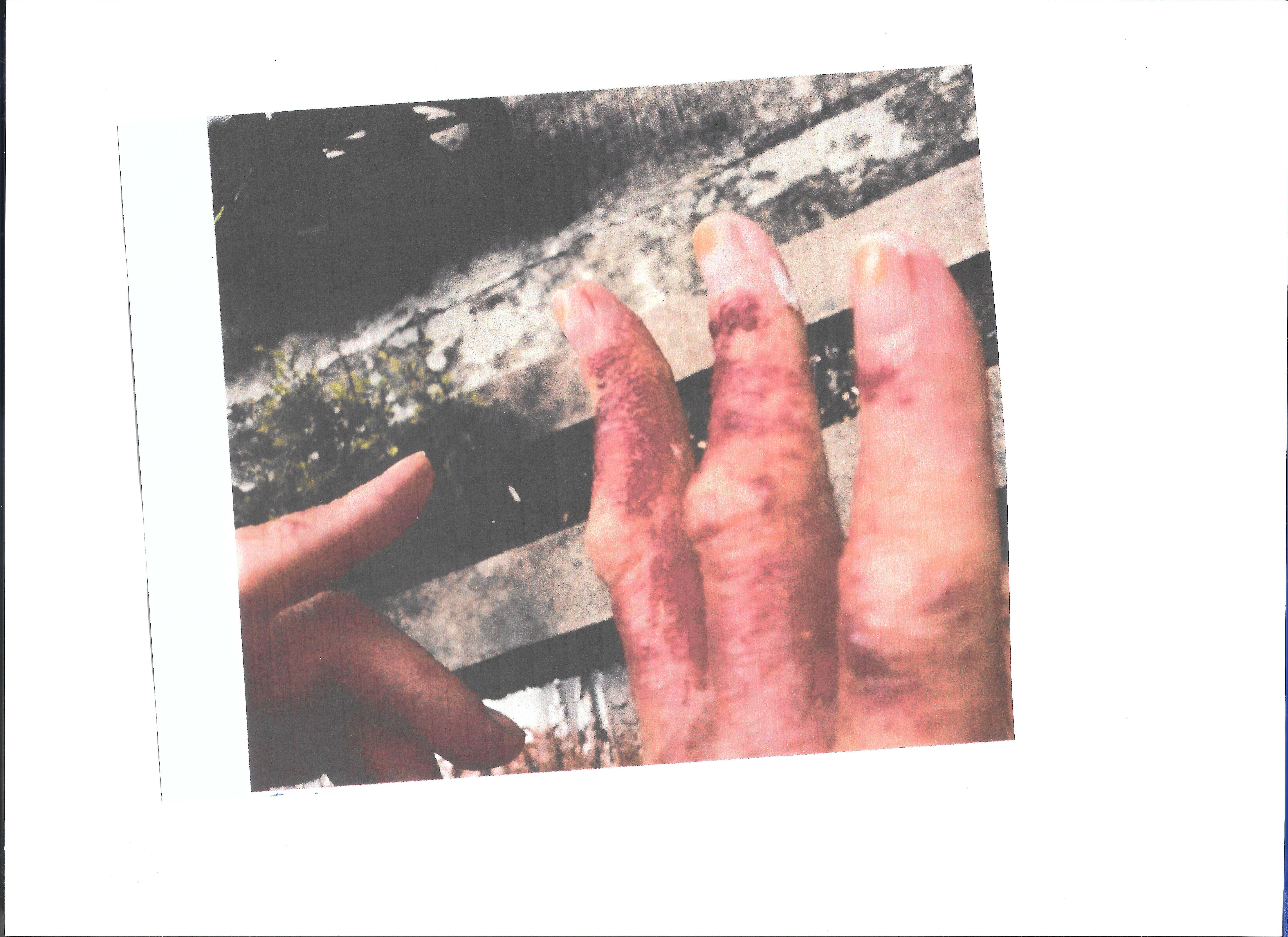 hier ist das Foto, dass mit meiner gestrigen Mail nicht hochgeladen werden konnte. Leider ist die Kopie von keiner guten Qualität. Bei der ferngesteuerten Attacke wurden beide Hände schwer verletzt. Die restlichen Fotos sind farblich manipuliert worden und so überzeichnet, dass ich sie nicht versenden kann.