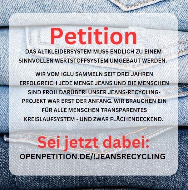 Bitte unterstützen Sie unsere Petition, damit endlich unser bestehendes Altkleidersystem zu einem sinnvollen Wertstoffsystem umgebaut wird. Das Jeans-Sammelsystem wäre erst der Anfang. Wir brauchen ein für alle Menschen transparentes Kreislaufsystem - und zwar fächendeckend.flächendeckend.