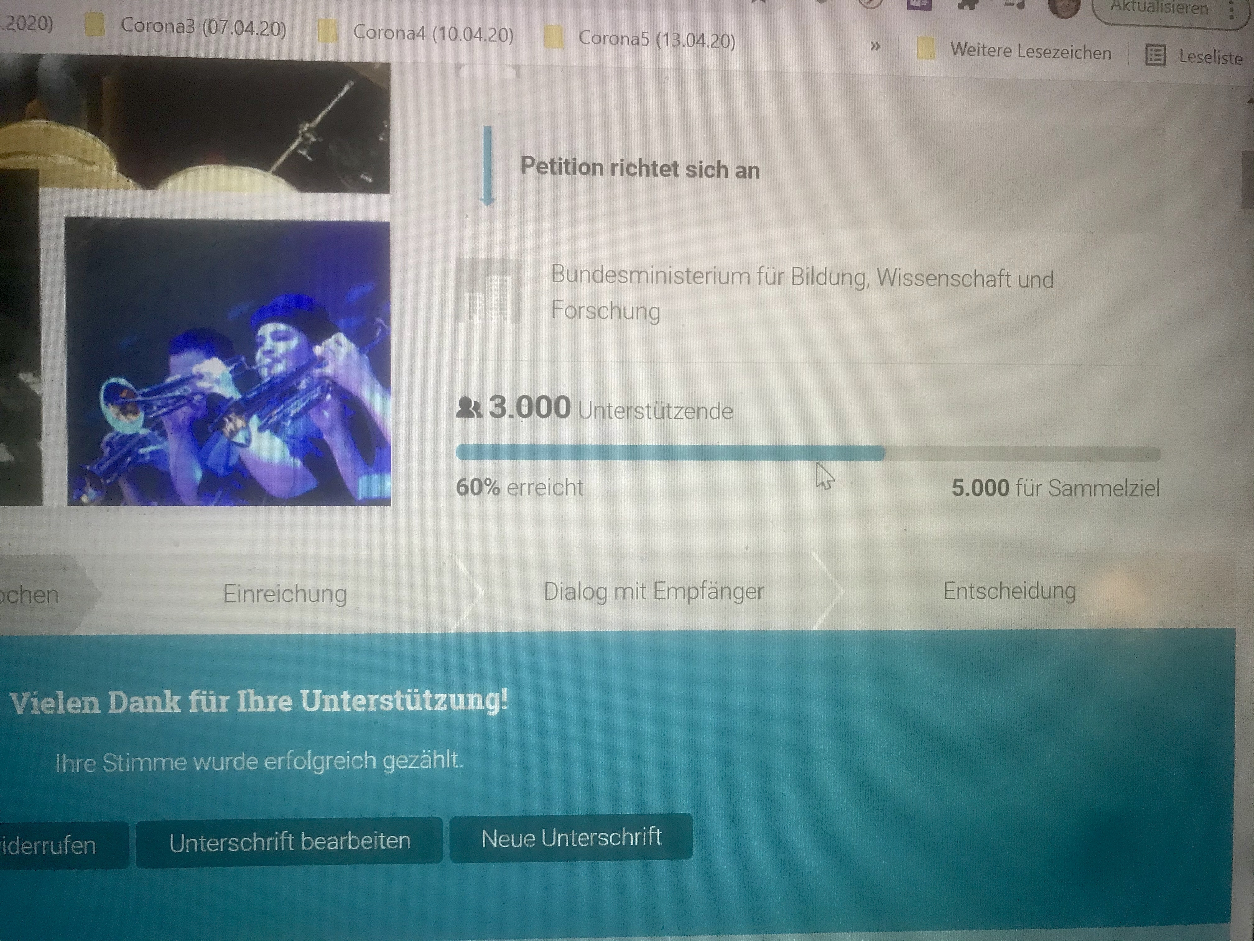 Wir planen eine 2. Online-Infoveranstaltung in ca. 2-3 Wochen. Termin und Meeting-Link wird hier und in Facebook verlautbart: www.facebook.com/musik.braucht.eine.stimme.im.bildungswesen