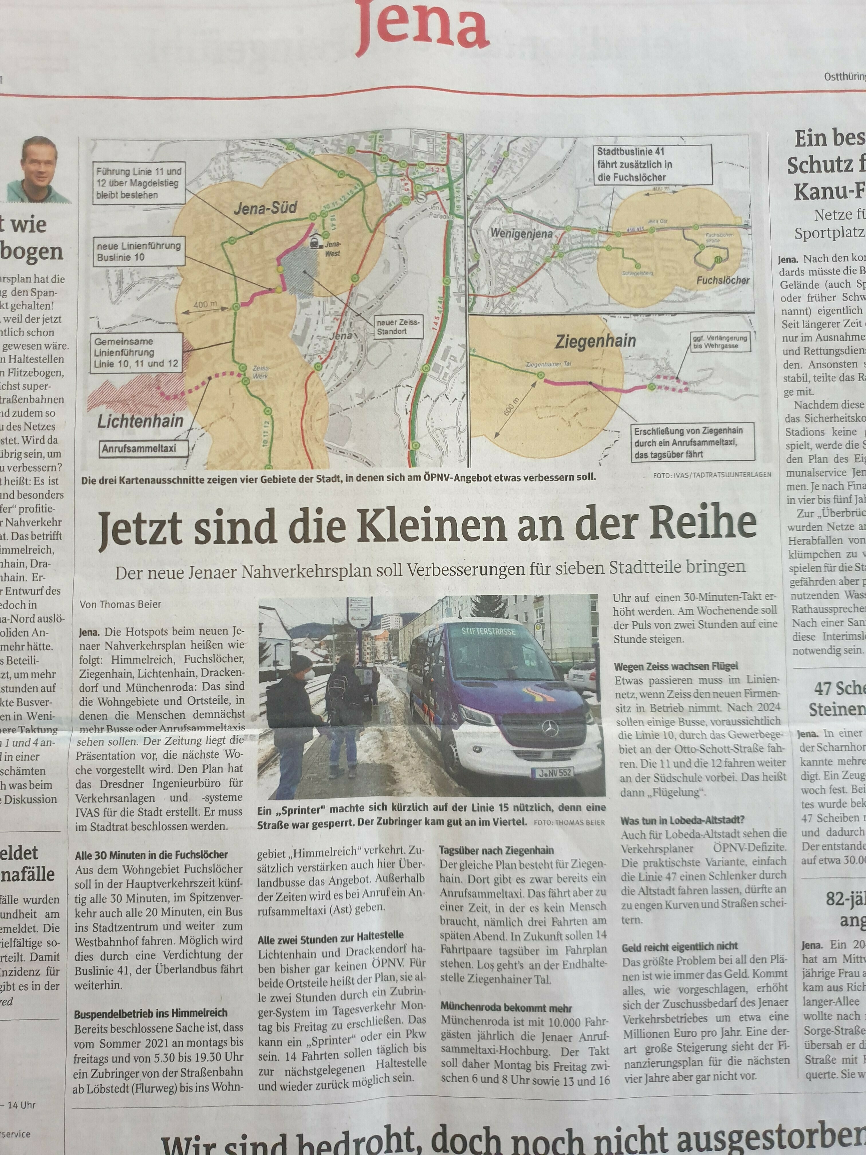 erste Informationen zum neuen Jenaer Nahverkehrsplan wurden in der gestrigen Presse veröffentlicht. Dieser ist noch nicht beschlossen. Man durfte jedoch etwas erstaunt sein, nachdem unsere Buslinie 42 immer wieder von der Stadt Jena ausgebremst wurde. Was jetzt so alles gehen soll und auf einmal ist dafür Geld vorhanden. Wir haben uns hierzu mit einem offenen Brief an den Oberbürgermeister Herrn Dr. Nitzsche und den Bürgermeister, Herrn Gerlitz gewandt. Den Brief stellen wir ebenfalls ein.