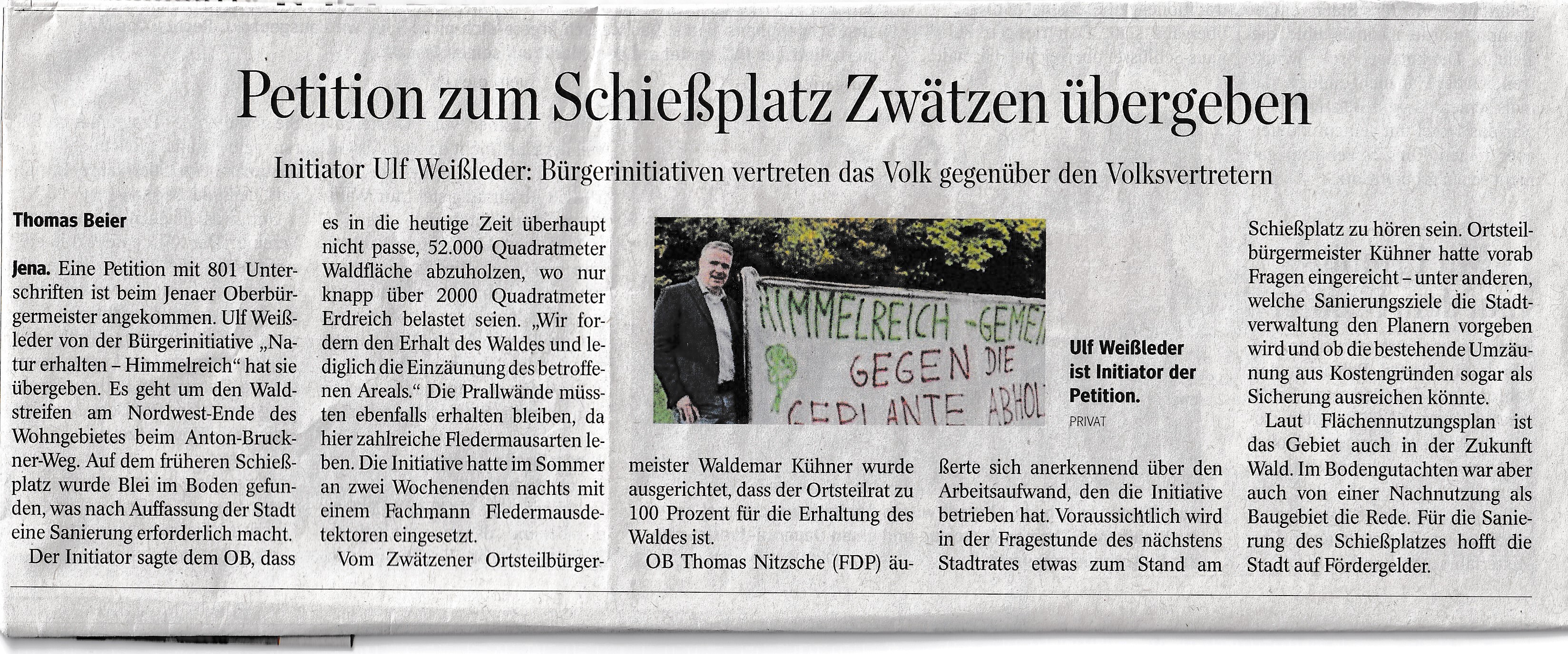 lange haben Sie/habt Ihr nichts von der Petition gehört. Diese wurde am 31.08.2023 mit 801 Unterschriften sehr erfolgreich beendet. Ich möchte mich bei allen UnterstützerInnen ganz herzlich bedanken. Wir hatten viele fleißige Hände zur Vorbereitung der Einwohnerversammlung und der Ortsteilratssitzung mit Bürgerbeteiligung. Zweimal haben wir in ganz Zwätzen und Teilen Löbstedts Einladungen an die Haushalte verteilt. Wir haben Banner am Wald aufgehangen und aufgestellt sowie an zwei Samstagen bis in die Nacht ein- und ausfliegende Fledermäuse an den Prallwänden am Schießplatz gezählt. Hier hatten wir tolle Unterstützung von Herrn Schmidt, einem Fledermausexperten. Vielen, vielen Dank noch mal. Wir sind im Himmelreich und Zwätzen zusammengewachsen und werden, wenn nötig, weiter Druck auf die Stadtverwaltung ausüben.