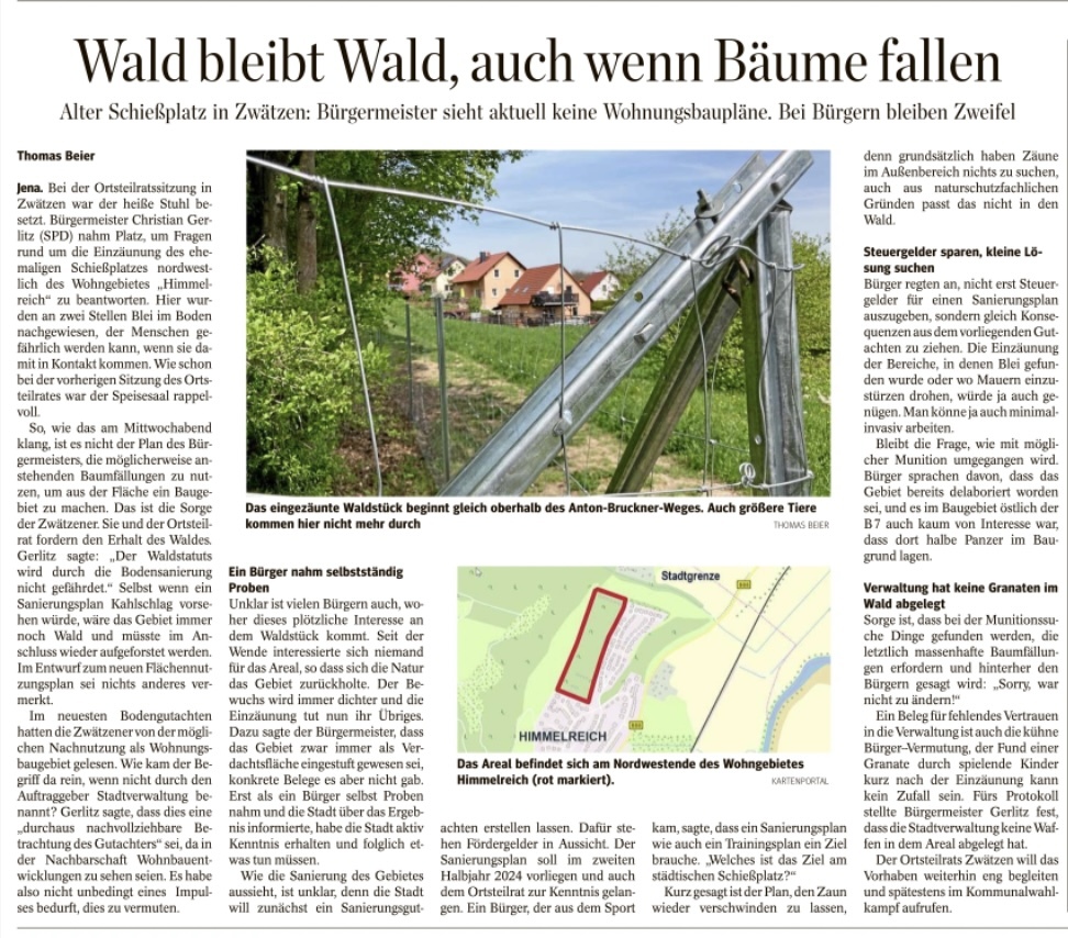 ich möchte Ihnen/Euch noch den Artikel aus der OTZ, von der Ortsteilratssitzung am 21.06.2023 nachreichen. Mittlerweile ist bei vielen von Ihnen/Euch eine gewisse Ernüchterung eingetreten. Was ist das Ergebnis der Diskussion mit Bürgermeister Gerlitz? Viel kann man nicht aus der Ortsteilratssitzung mitnehmen und den Worten keine große Bedeutung schenken. Zu oft hat die Politik die BürgerInnen in Jena getäuscht. Das kam ja auch ganz klar in der Ortsteilratssitzung von den TeilnehmerInnen gegenüber Herrn Gerlitz zum Ausdruck.