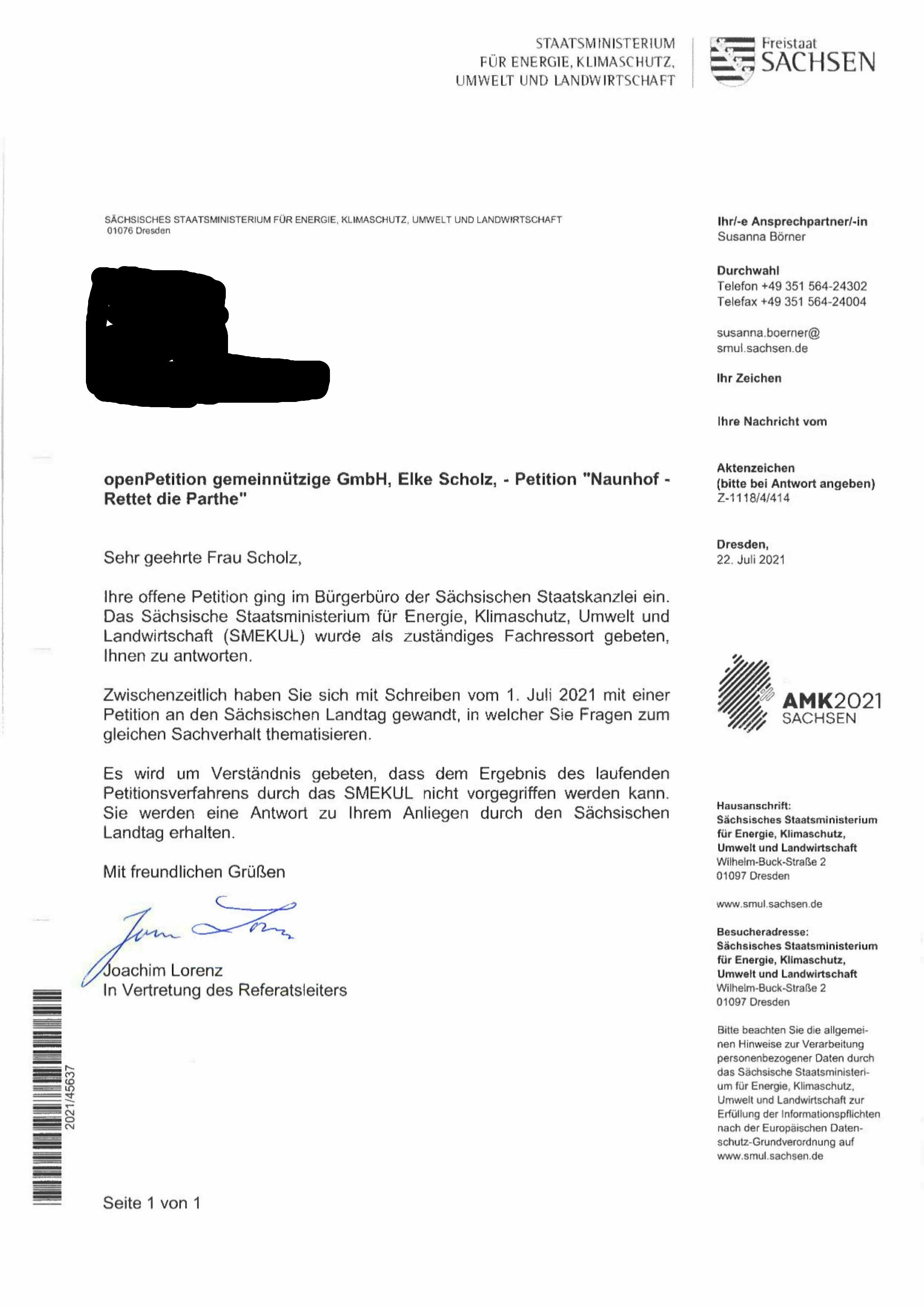 Nun ist nach mehrmaligen Nachfragen, die Antwort vom sächsischen Landtag eingetroffen! Wie zu erwarten, nicht gerade erfolgversprechend;) Das ist natürlich auch leider so, weil viel zu wenig Bürger von Naunhof, sich daran beteiligt haben, sehr Schade, dass es so wenige interessiert, was mit unserer Parthe und den angrenzenden Wäldern ohne Wasser passiert;( Aber ich hoffe, dass mit dieser Petition, ein bisschen die Gemeinde und ihre Bürger im Gespräch bleiben, wie es mit unserer Parthe weiter gehen soll;) Wenn nichts passiert, wird bald die nächste Petition gestartet, Jetzt hat man ja schon etwas mehr Erfahrung gesammelt Bleiben sie alle schön Gesund, bis zum nächsten Mal.