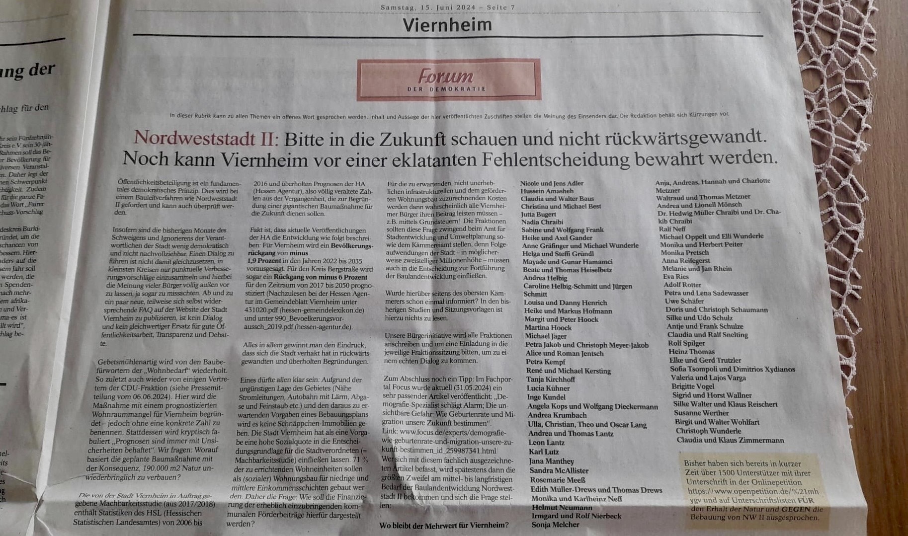 06.06.2024 Basın Özeti Viernheimer Bürgerinnen und Bürger setzen deutliches Zeichen gegen Bebauung von Nordweststadt II