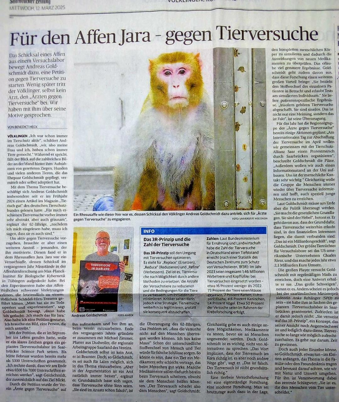 ein brandaktueller Artikel in der Saarbrücker Zeitung über Dr. Kirchhoff, dem Initiator von "Tierversuche verstehen" ist gemeinsam mit einem pro Tierversuche-Kommentar am 22.10.2025 veröffentlicht worden: