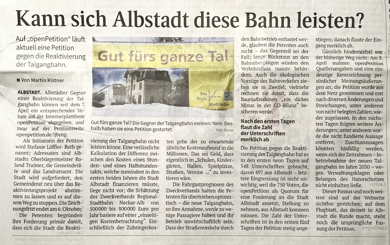 - Albstadt kann sich eine Talgangbahn nicht leisten! Eine nicht vorhersehbare Kostenbelastung verhindert wichtige, zukünftige Investitionen (Schulen, Kindergärten, Hallen, Spielplätze, Straßen, Vereine, ...) #Eigene Meinung#