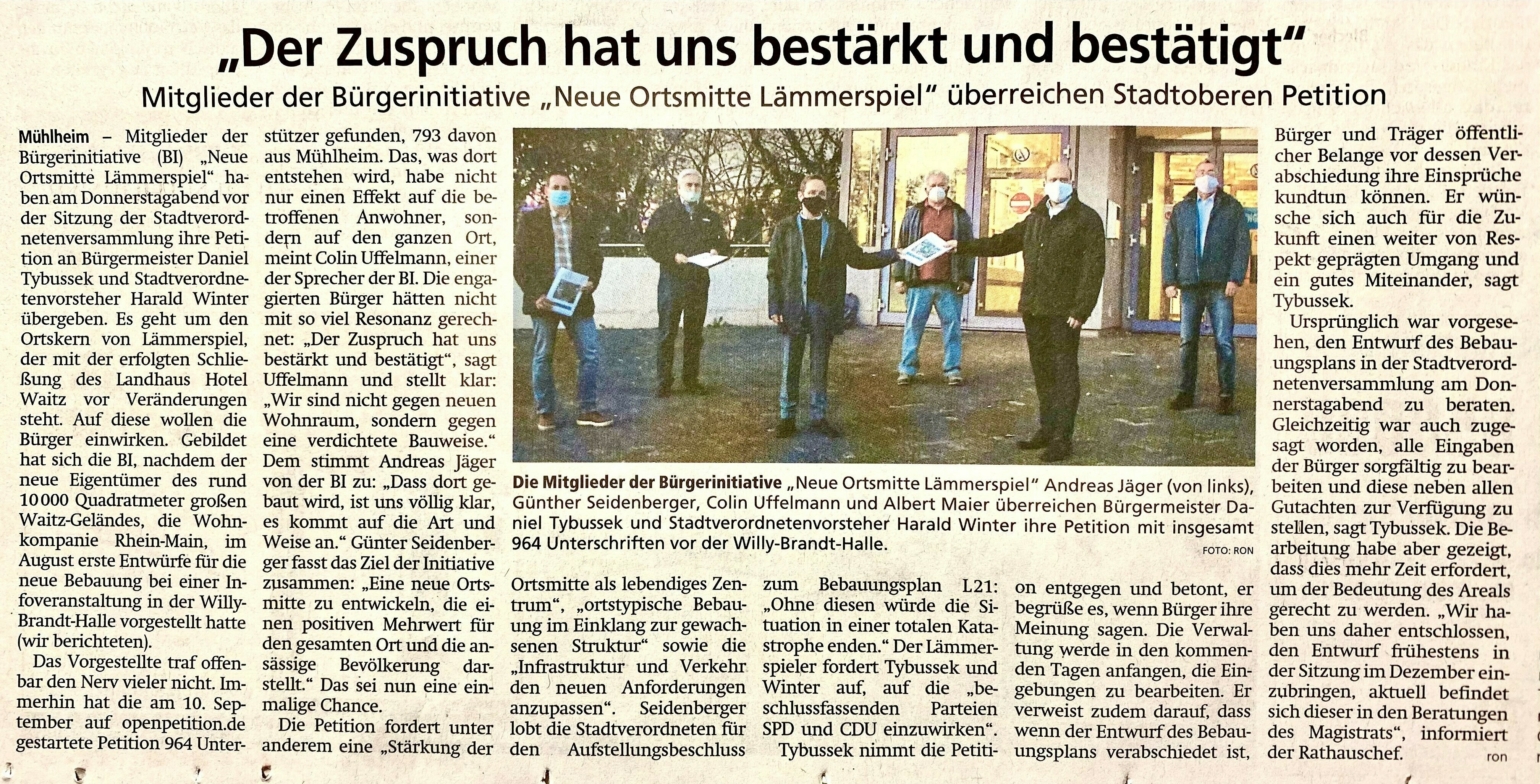 Die Petition ist nach sechswöchiger Zeichnungsfrist auf unglaubliche 791 Mühlheimer Stimmen gekommen. Über die Stadtgrenzen hinaus sind es sogar 962 Stimmen, welche unsere Überzeugung und das Engagement für eine gewissenhafte Gestaltung der Lämmerspieler Ortsmitte teilen.
