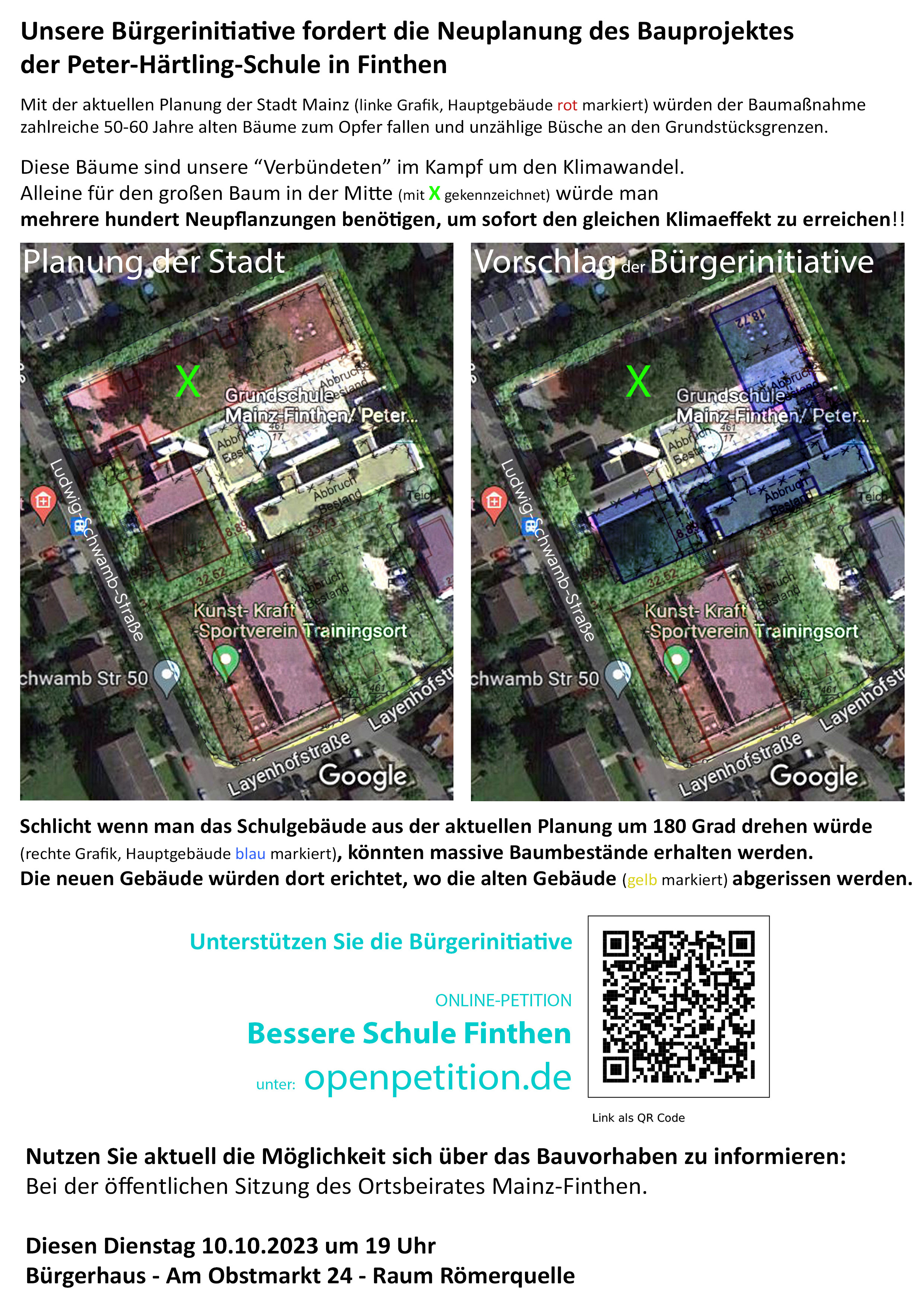 Der Ortsbeirat (Quelle: www.lokalezeitung.de/2023/03/24/finthen-braucht-eine-neue-drei-felder-halle/) habenhat einstimmig eine Dreifeld-Turnhalle mit Tribüne gefordert. Da das wegen Platzmangel auf dem Gelände der Peter-Härtling-Schule nicht geht, sollte nach unserer Meinung die Halle an anderer Stelle in fußläufiger Entfernung gebaut werden, für Schul- und Vereinsportzwecke in einer einzigen Halle. Das ist ökologisch und ökonomisch sinnvoll.