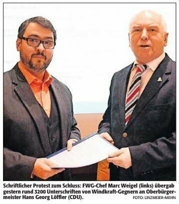im Namen der Freien Wählergruppe Neustadt an der Weinstraße e.V. möchte ich Ihnen sehr herzlich für die große Unterstützung für unsere Petition gegen einen Windpark mit 212-Meter hohen Anlagen in Mußbach danken. Die Aktion hat für den nötigen Druck gesorgt. Im Namen der Unterzeichnerinnen und Unterzeichner habe ich die Liste mit mehr als 3300 Unter-schriften in der Stadtratssitzung am 15.3. übergeben.
