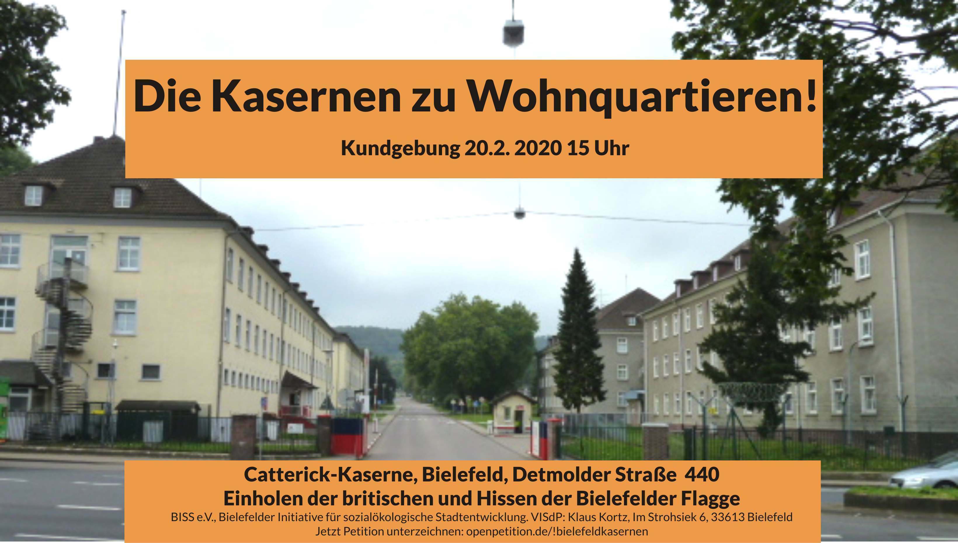 Am 20.02.2020 gibt die Britische Rheinarmee das Gelände der Catterick-Kaserne zurück an ihren Eigentümer, die Bundesrepublik Deutschland, vertreten durch die Bundesanstalt für Immobilienangelegenheiten BImA. Mit der Rückgabe der letzten Kaserne endet eine über 80 Jahre andauernde Nutzung innerstädtischer Flächen für militärische Zwecke. Wie schon die Übergabe der Rochdale Kaserne soll dies als reiner Verwaltungsakt, ohne öffentliche Beteiligung und Würdigung geschehen. Die beiden Kasernen wurden 1934 dem Deutschen Reich kostenlos von der Stadt Bielefeld für militärische Nutzung überlassen. Das Ende der militärischen Nutzung ist ein Ereignis von historischer Bedeutung und deshalb ein Grund zu feiern. Deshalb lädt die Bielefelder Initiative für sozialökologische Stadtentwicklung, BISS, ein zum