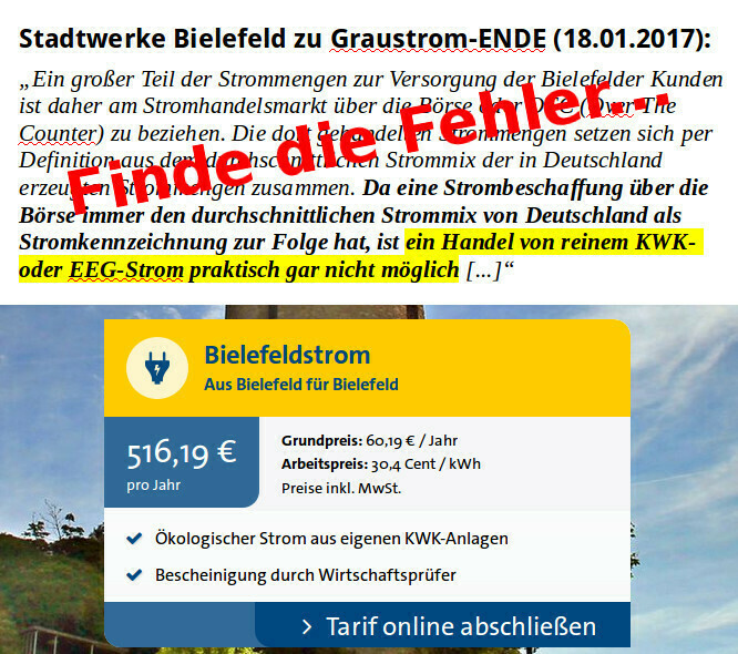 Besonders widersprüchlich ist, dass die Stadtwerke einerseits behaupten, ein reiner KWK-Stromhandel sei unmöglich, sie aber andererseits einen „Bielefeldstrom“-Tarif anbieten, der genau das tut: KWK-Strom aus Bielefelder Anlagen verkaufen = Stromhandel ohne Kohle- und Atomstrom“