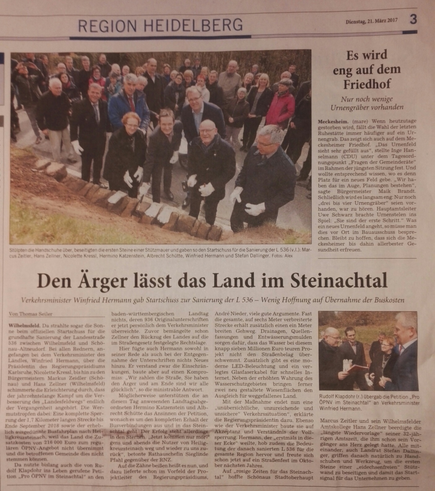 Offizielle Übergabe der Original-Petition an Verkehrsminister Winfried Herrmann beim Spartenstich am kommenden Montag, den 20.03.2017 um 12:00 Uhr in Höhe Firma Kling an der L536
