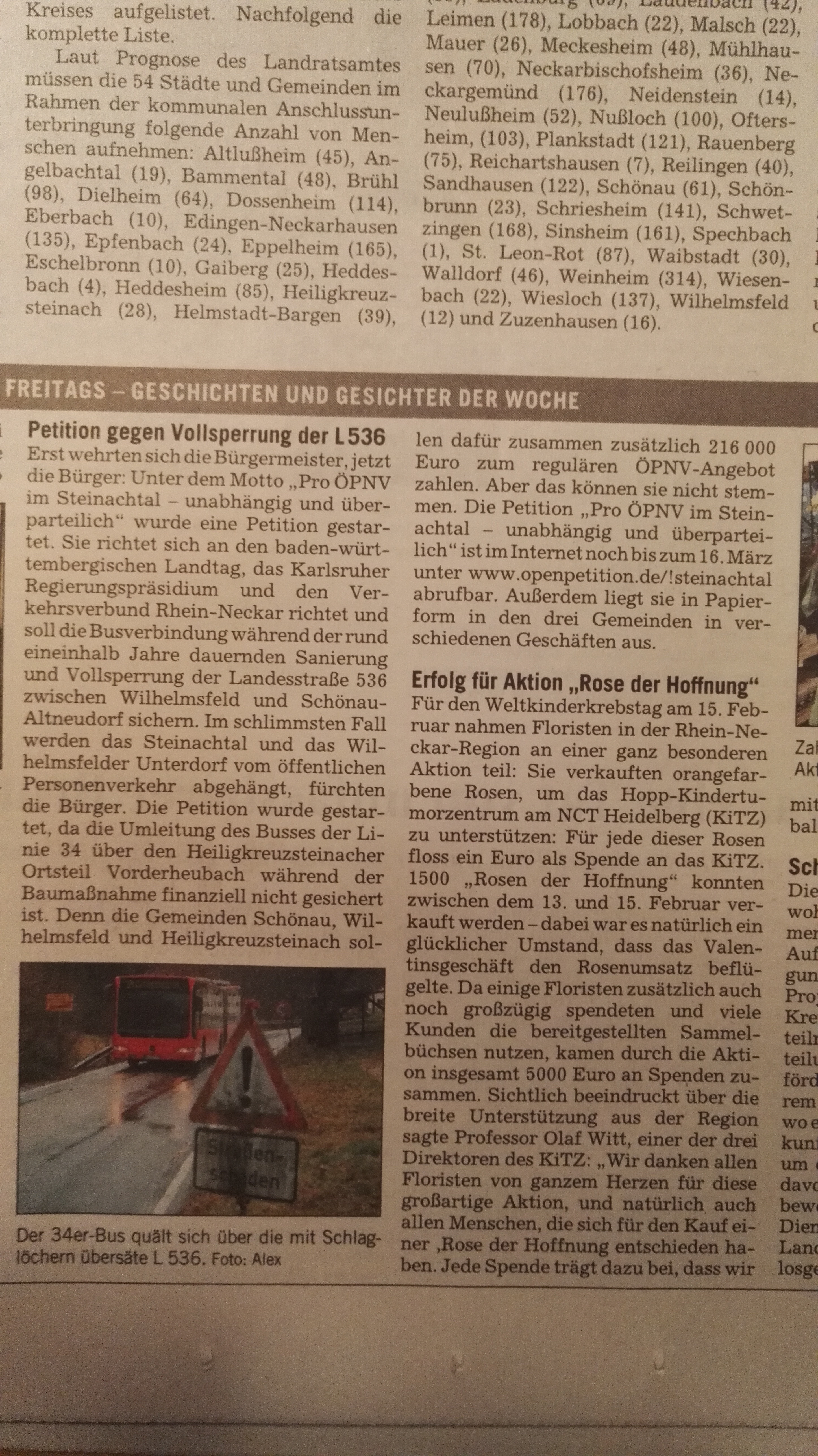 Neuer Petitionstext: Ab März 2017 will das Land Baden Württemberg die Landstraße L 536 zwischen Schönau-Altneudorf und Wilhelmsfeld nach 40 Jahren komplett sanieren. In diesem Zug findet für 1,5 bis 2 Jahre (!) eine Vollsperrung statt. Bei einer Bürgerinfoveranstaltung am 24.11.2016 des RP-Karlsruhe wurden die Bürger darüber informiert, dass der ÖPNV in dieser Zeit umgeleitet wird um somit zu bewerkstelligen, dass Schüler und Pendler an ihre Zielorte befördert werden. Die Umleitungsstrecke für das Steinachtal soll über die oberen Gemeinden von Heiligkreuzsteinach führen und auch das Unterdorf in Wilhelmsfeld würde weiterhin von Bussen bedient, so die damaligen Aussagen.