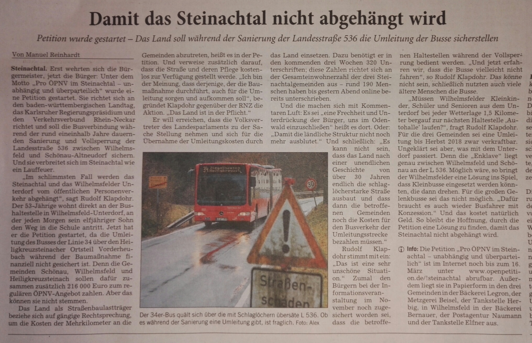 Die Bürger und vor allem die Nutzer des ÖPNV werden jetzt auch im Amtsblatt des GVV Schönau aufgerufen, sich mit ihrer Unterschrift an der Petition zu beteiligen.
