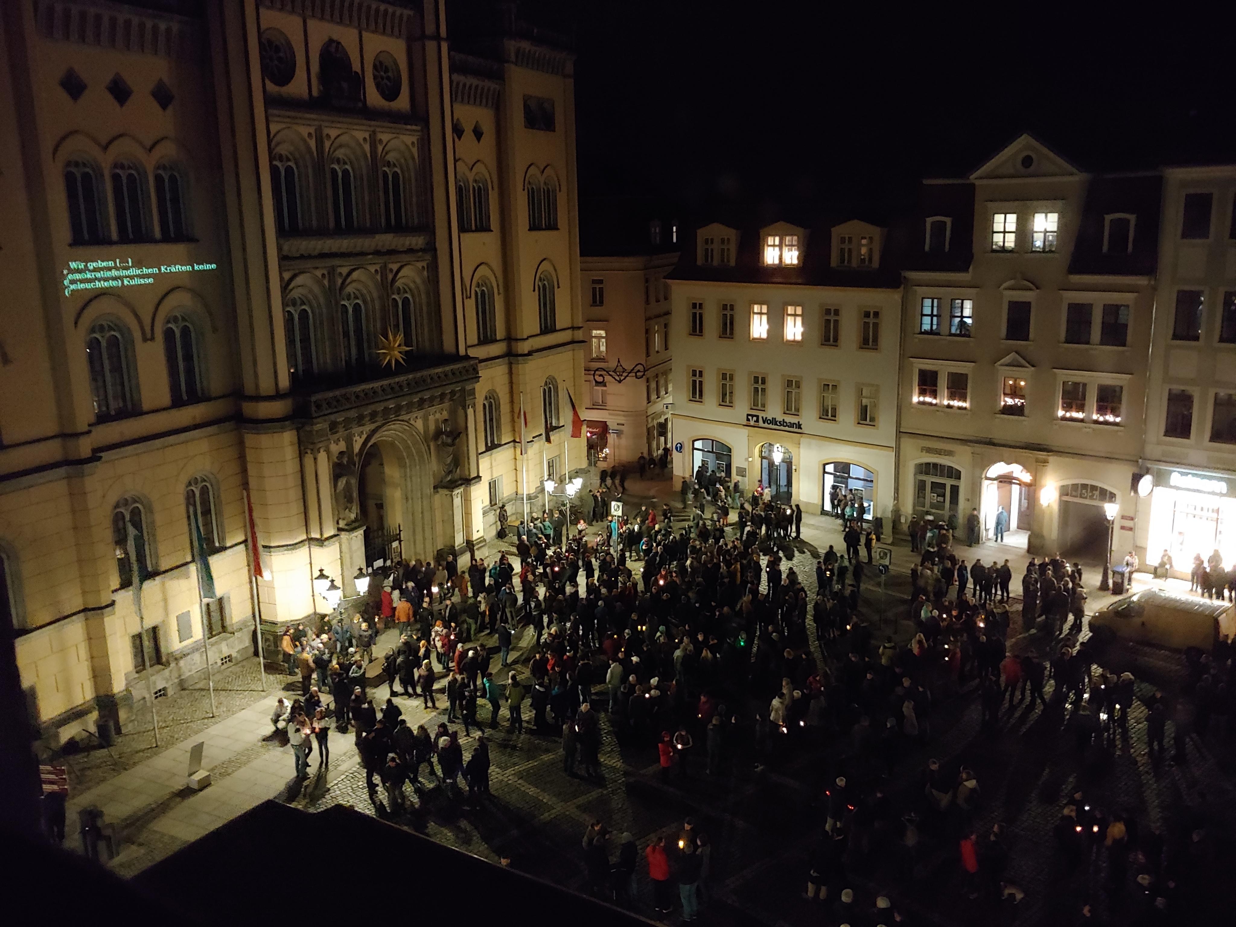 An einem der letzten Montage haben wir uns erlaubt, einige der Statements aus der Petition als "Stimme der stilleren Bürgerschaft" ans Zittauer Rathaus zu projizieren. Am heutigen Montagabend, den 17.01., war wiederholt die offiziell angemeldete Mini-Demo auf dem Zittauer Marktplatz präsent. Öffentliche Versammlungen sind ein hohes Gut in unserer Demokratie und erfahren selbstverständlich die Unterstützung durch das Bündnis #zittaugemeinsam. Nicht allein die Meinung wird dargestellt, sondern auch der dringend nötige Dialog wird so angeregt. Auf Lichtprojektionen haben wir dieses Mal bewusst verzichtet, denn uns machte es betroffen, wie eingeblendete Kommentare aus der Petition am 03.01. und sogar das Opfergedenken am 10.01. pietätlos und unter Gelächter weggeleuchtet wurden (der MDR Sachsenspiegel berichtete). Deshalb sollte diese Woche keine Angriffsfläche geboten werden. Erneut blieben auch dieses Mal öffentliche Gebäude unbeleuchtet.