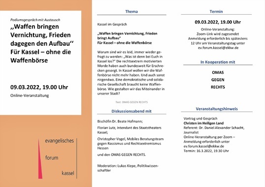 Sie haben vor etwa einem Jahr die Petition „Keine Waffenbörse in Kassel“ unterschrieben. Vielen Dank für Ihre klare Stellungnahme! Der Magistrat hat der Forderung der Stadtverordnetenversammlung entsprochen - das Gericht hat jetzt über den Verbleib der Waffenbörse zu entscheiden. Wir wollen in der Stadtgesellschaft deutlich machen, warum wir die Waffenbörse nicht länger haben wollen. Und auch alle weiteren Schritte gegen Rechts bedenken. Mit der Bischöfin Dr. Beate Hofmann, dem Intendanten des Staatstheaters Florian Lutz, mit Chr. Vogel vom Mobilen Beratungsteam gegen Rechts und den OMAS GEGEN RECHTS. Alle weiteren Informationen entnehmen Sie bitte dem Flyer. Reden Sie mit! Für Kassel OHNE Waffenbörse und ohne rechte Gewalt. Bitte melden Sie sich per Mail an: ev.forum.kassel@ekkw.de. Der Link wird Ihnen am Tag vor dem Gespräch zugesandt.