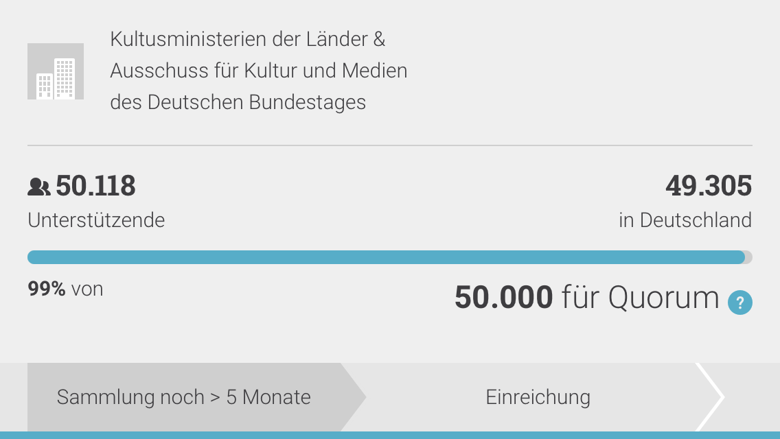 Für das Quorenziel der Stimmen aus Deutschland FEHLEN nur noch 700 UNTERSCHRIFTEN und diese Petition bekommt das Anhörungsrecht im Petitionsausschuss!