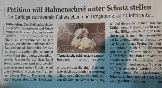 Danke an den Geflügelzuchtverein Fallersleben und besonders seinem Pressewart, Dieter Prehn, zur tatkräftigen Unterstützung der Petition mit Aufruf in der Region! 👍💪😘