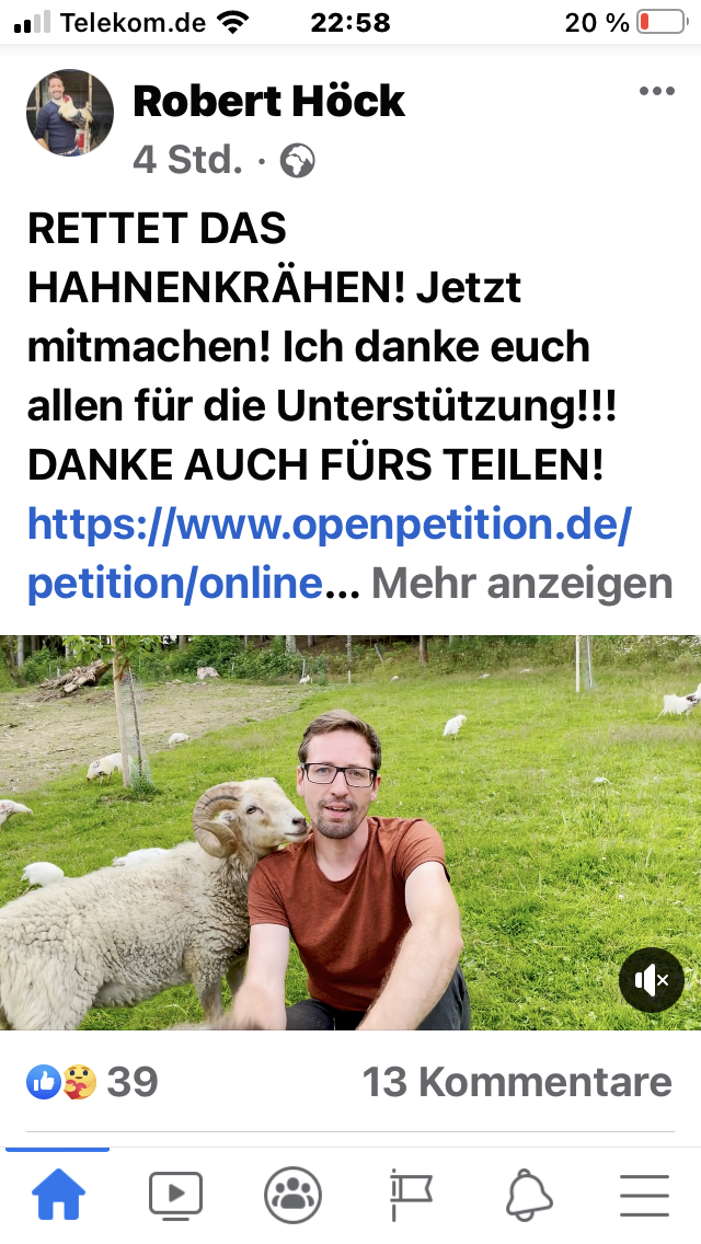 Danke an Robert Höck von Happy-Huhn für ein zweites tolles Video und Aufruf zur Teilnahme an der Petition zum Schutz des Landlebens mit dem Hahnenkrähen! 👍💪🤗